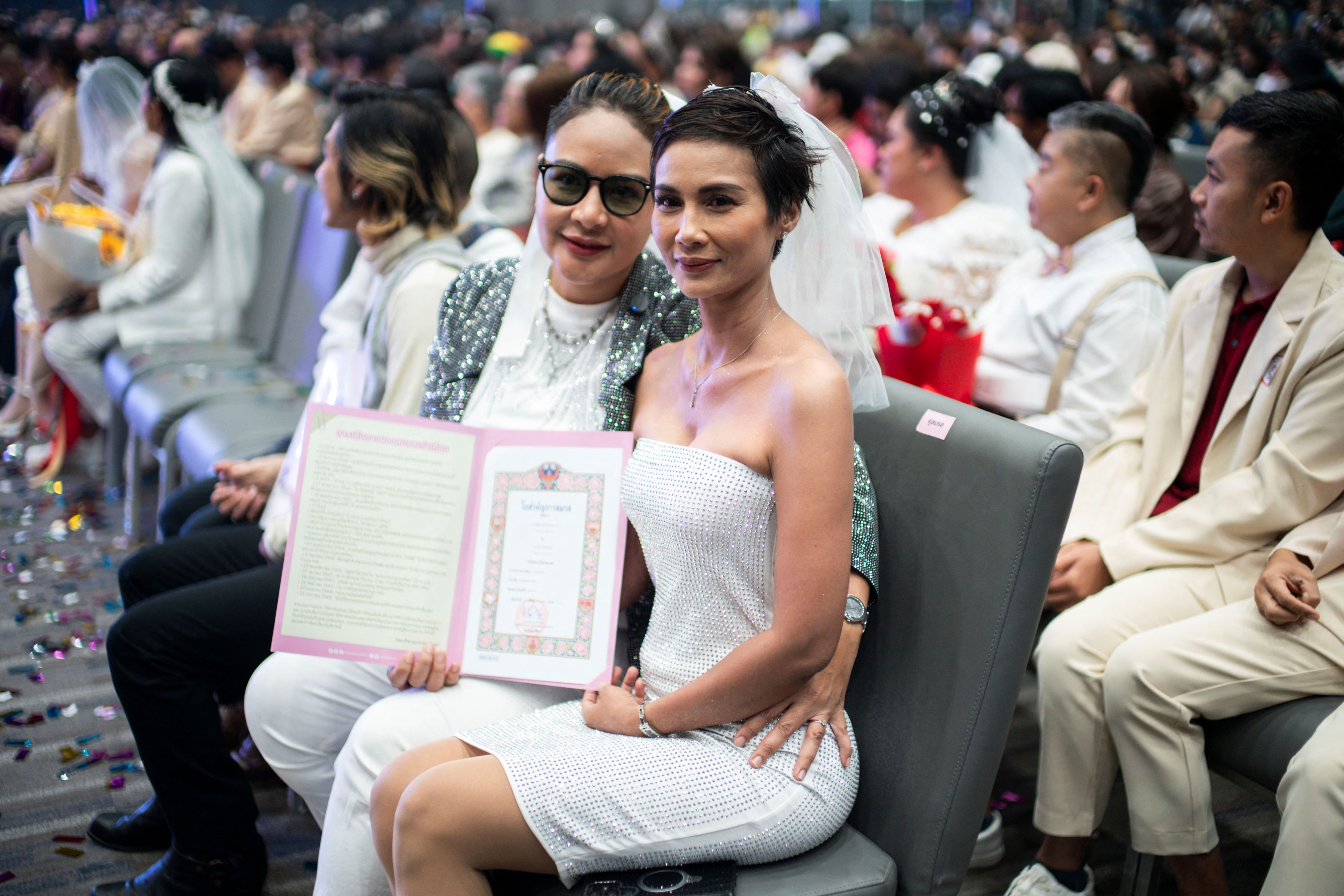 Ruchaya Nillakan (L) and Nuttimon Sanyamast (C), same-sеx couple, attend their marriage registration event at Paragon shopping mall in Bangkok on January 23, 2025. A high-profile gay couple married in Thailand on January 23 as the kingdom's same-sex marriage law went into effect, an AFP journalist saw, among the first of hundreds expected to do so. (Photo by Chanakarn Laosarakham/AFP Photo)