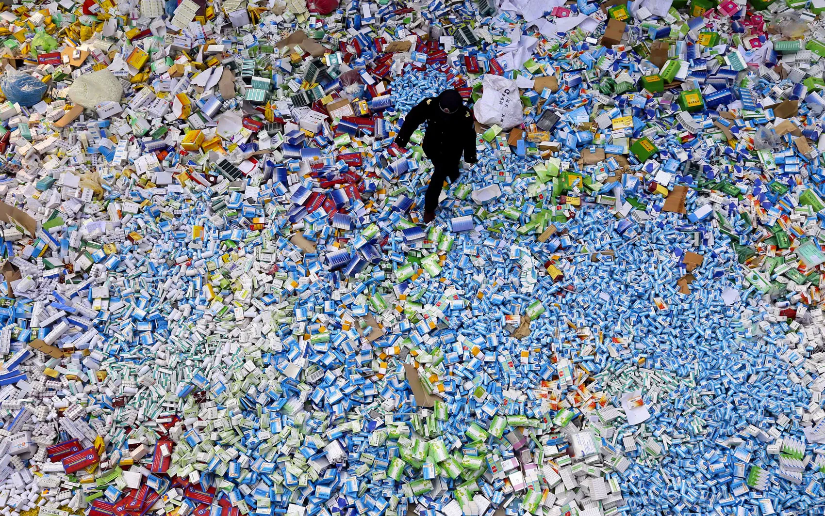 This picture taken on March 14 shows a Chinese policeman walking across a pile of fake medicines seized in Beijing in recent months, which were later destroyed. The rapid growth of Internet commerce has led to an explosion of counterfeit drugs sold around the world, with China the biggest source of fake medicines, pharmaceutical experts said as the illicit trade is now believed to be worth around 75 billion USD globally, with criminal gangs increasingly using the web to move their products across borders. (Photo by AFP Photo)