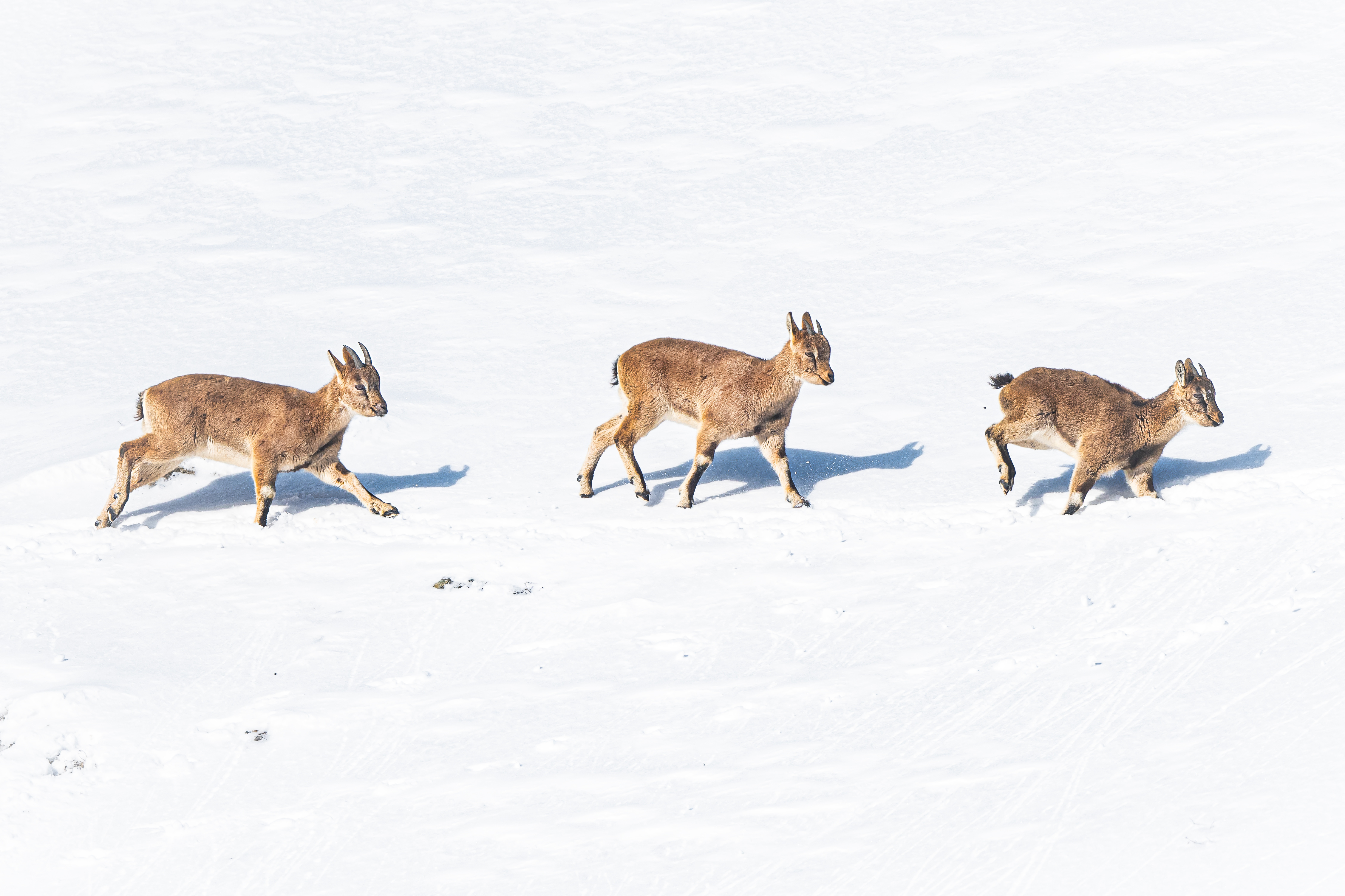 Wild goats are seen searching for food in snow covered terrain at the Munzur Valley National Park in Tunceli, Turkiye on January 10, 2025. Tunceli, which includes the Munzur Valley National Park, one of the largest national parks in Turkey, attracts attention with its natural, historical and cultural beauties as well as its wildlife richness. The city, with its steep mountains, deep valleys and forested areas, offers habitat to many different types of wild animals. (Photo by Alper Tuydes/Anadolu via Getty Images)