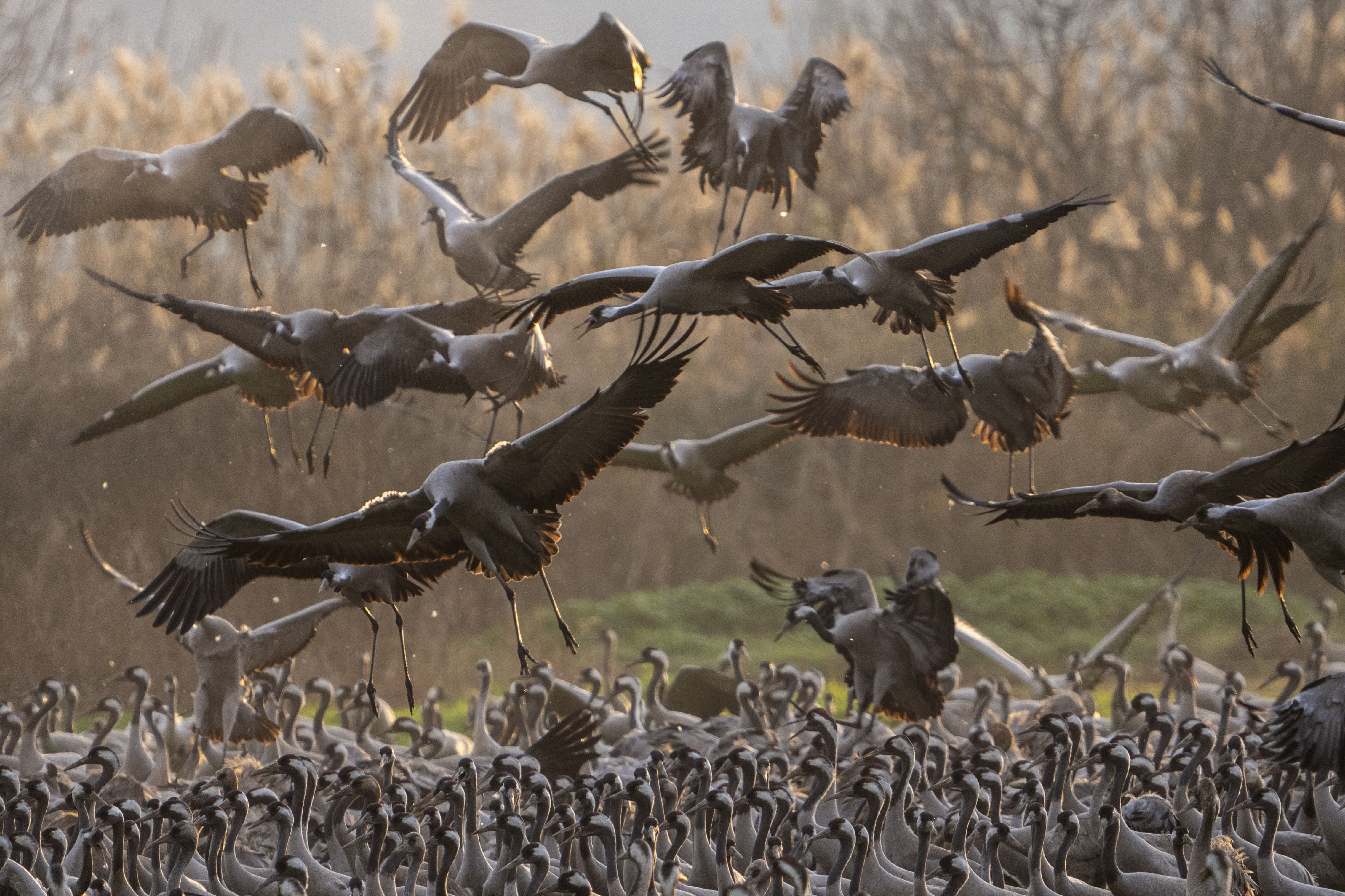 Migrating cranes flock at sunrise in Hula Lake conservation area, north of the Sea of Galilee, northern Israel, Thursday, January 23, 2025. (Photo by Ariel Schalit/AP Photo)