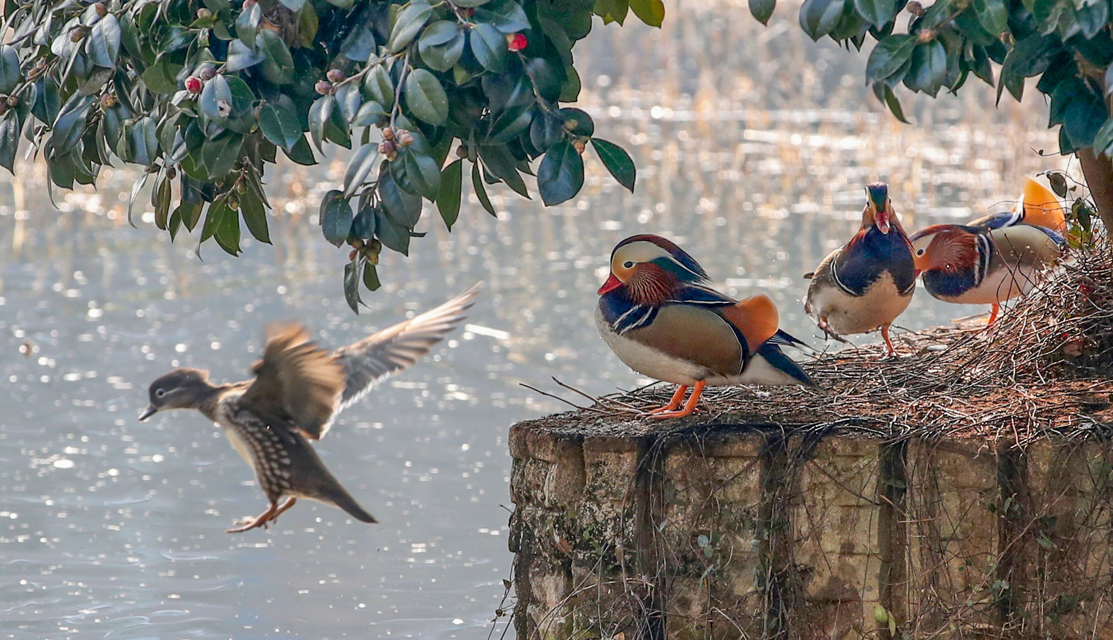 On January 20, 2025, when the weather was warm like spring, the natural monument, mandarin ducks, are spending the winter in Yongji, a reservoir on the campus of Chonnam National University in Seoul, South Korea. (Photo by Kim Young-geun)
