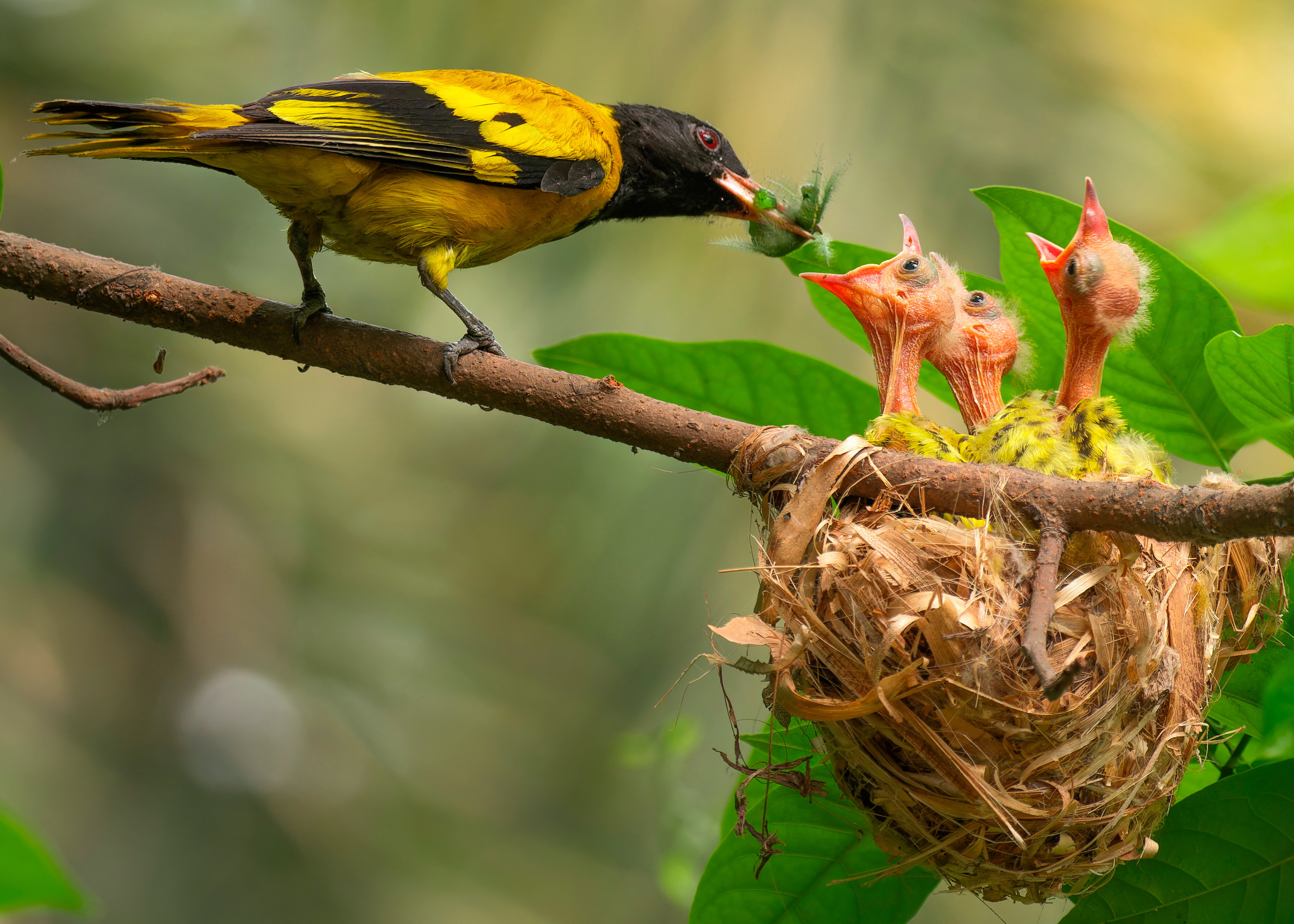 A black-hooded oriole feeds its newly hatched chicks in Kolaghat, West Bengal, India in the last decade of January 2025. (Photo by Arpan Hanra/Solent News)