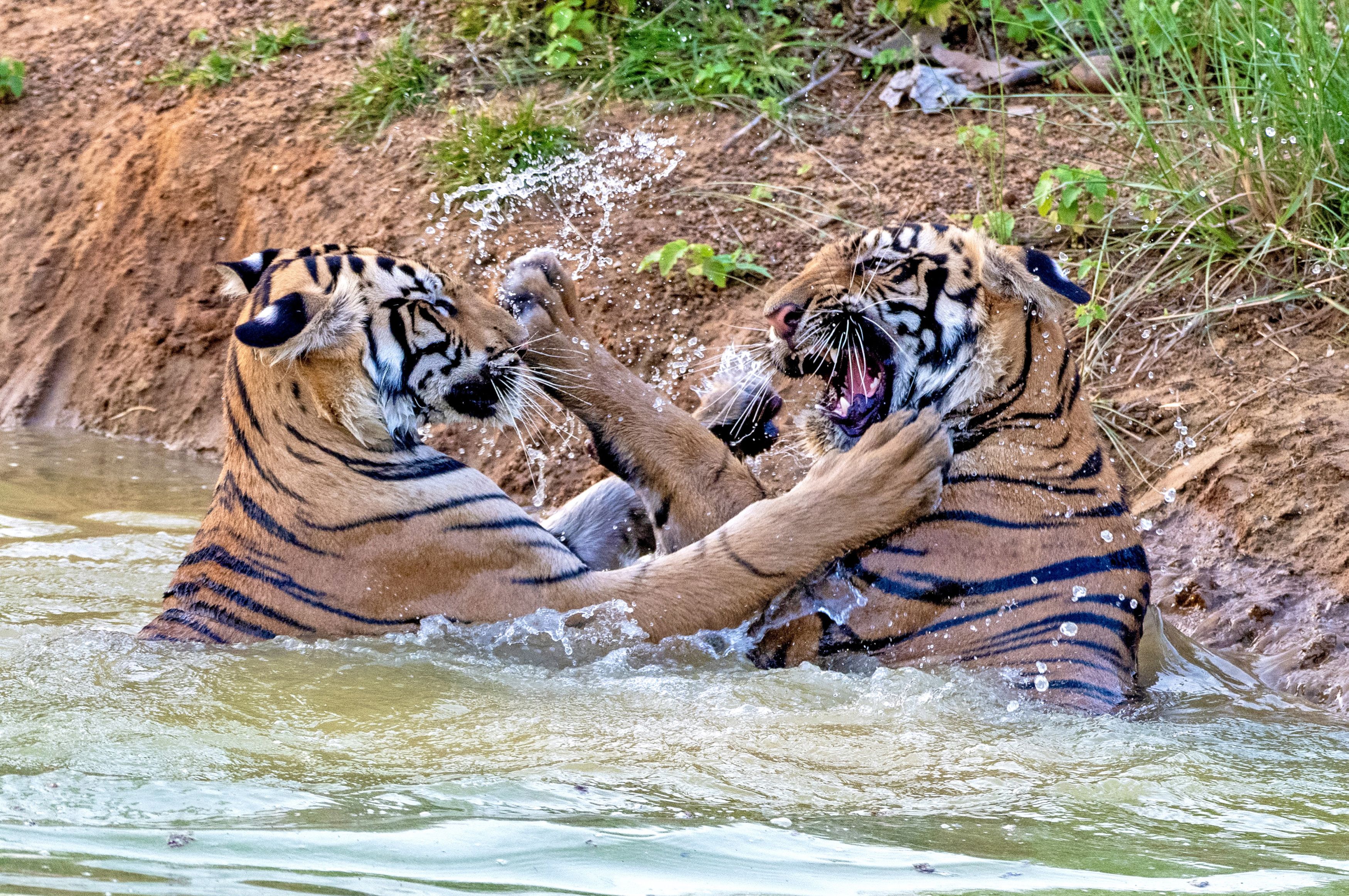 Two tigers, a brother and sister, take playful swipes at each other in Tadoba, India in the last decade of January 2024. One of the tigers had been cooling down in the water before its sibling started the fight. (Photo by Dhiraj Singh/Solent News)