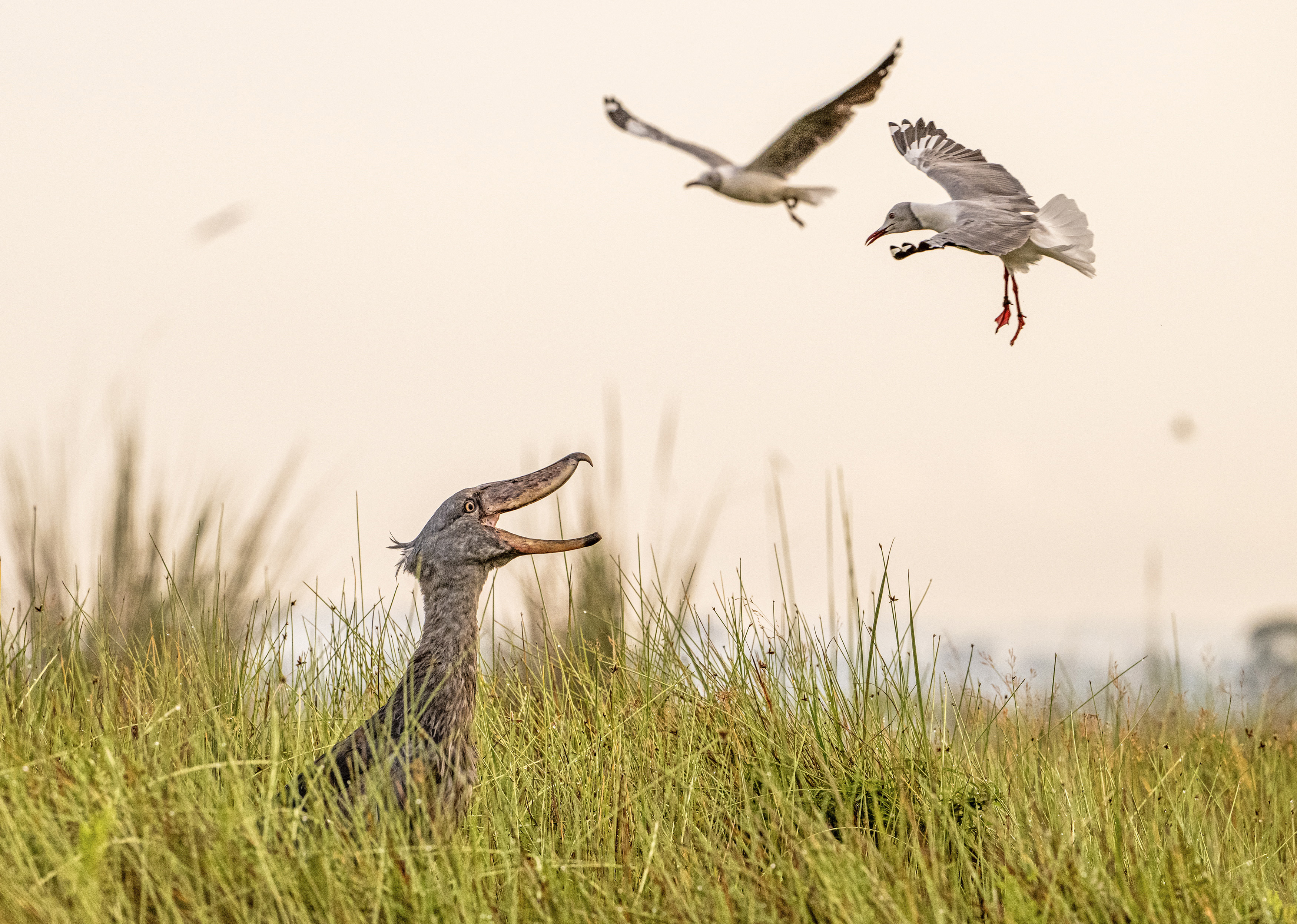 A shoebill in the wetlands of Mabamba Swamp on the northern shore of Lake Victoria in Uganda was mobbed by gulls as it came close to their nesting site in the last decade of January 2024. (Photo by Renato Granieri/Solent News)