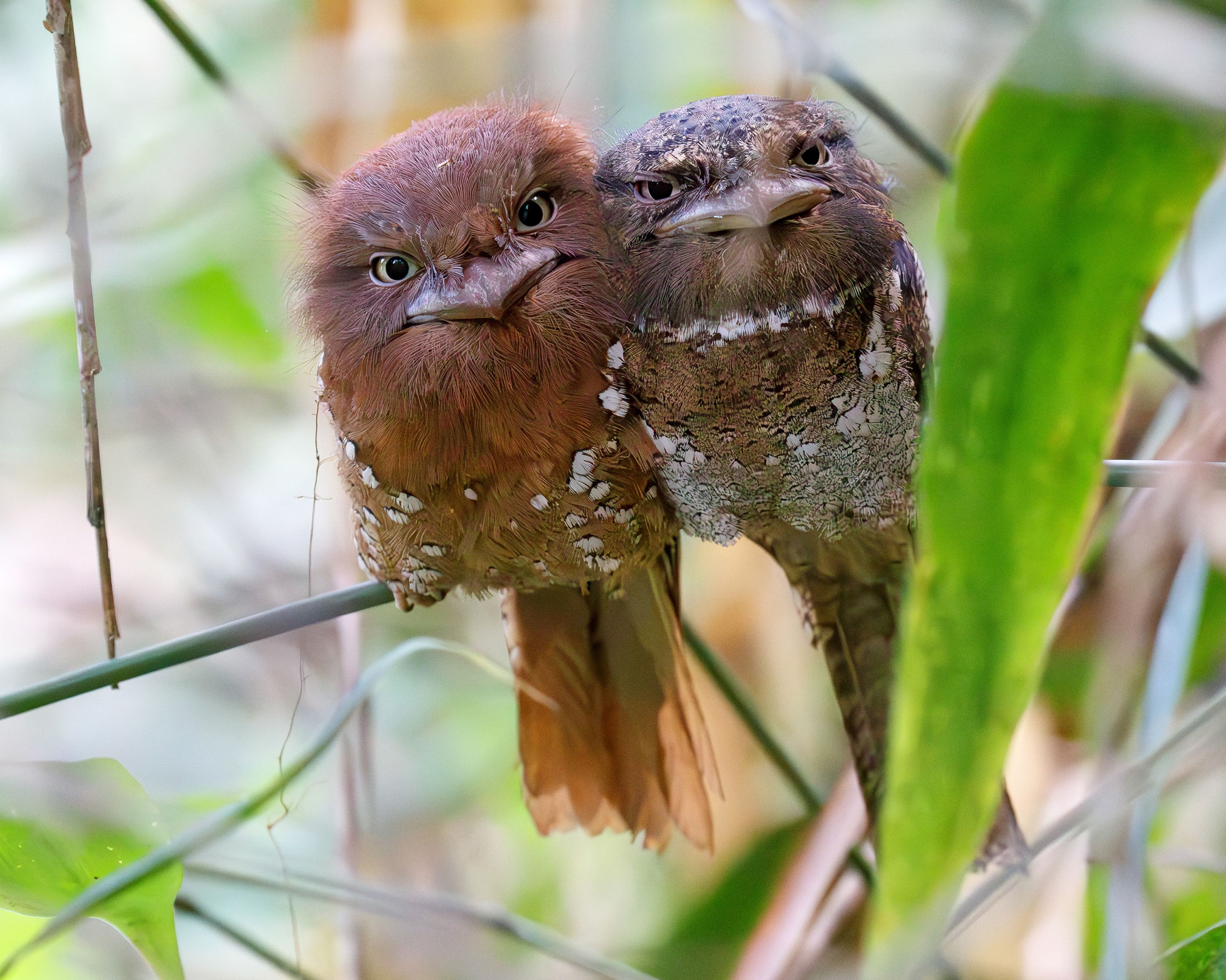Frogmouth birds huddle up together on a thin branch in the Sinharaja Forest Reserve, Sri Lanka in the last decade of January 2025. They are nocturnal and perch in thickets during the day, camouflaged by their plumage. (Photo by Samson So/Solent News)