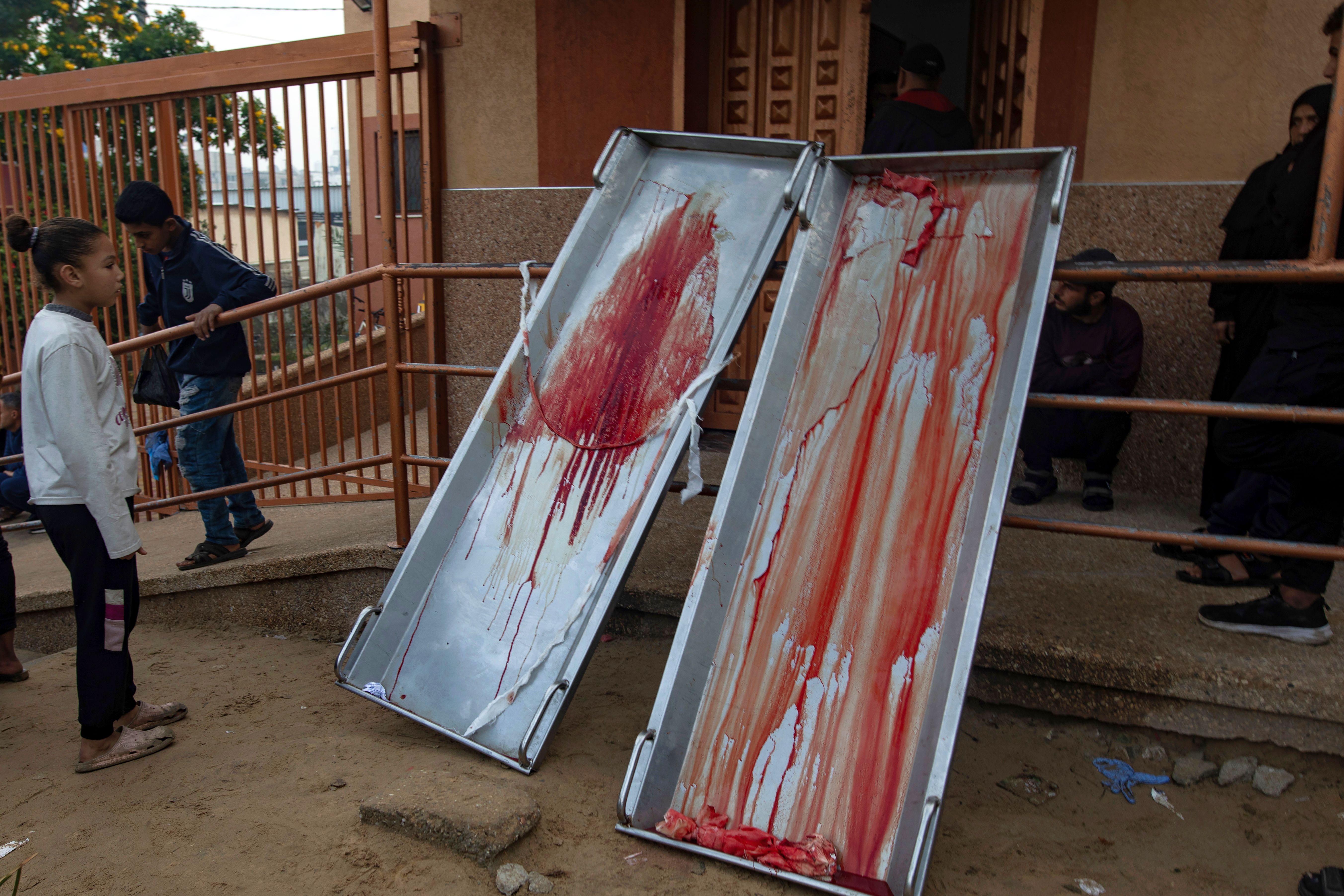 A Palestinian girl stands near blood stained body trays outside the morgue at Nasser Hospital in Khan Yunis, southern Gaza Strip, 16 January 2025. According to medics at Nasser Hospital, at least four Palestinians, including a journalist, were killed overnight after an Israeli airstrike in southern Gaza's Khan Yunis. (Photo by Haitham Imad/EPA/EFE)
