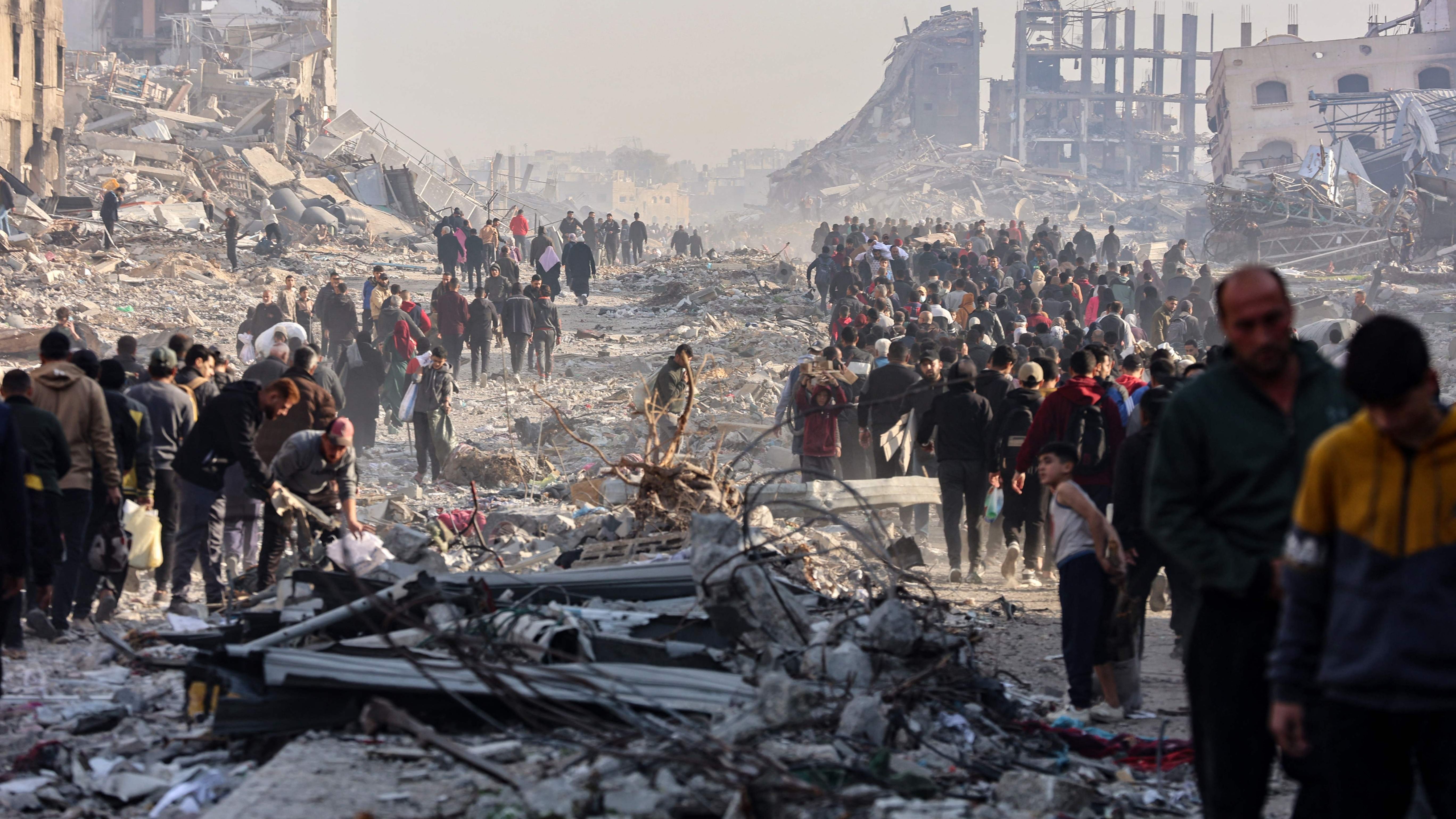 Scores of displaced Palestinians walk along a road in the Saftawi area of Jabalia, as they leave areas near Gaza City where they had taken refuge, toward the further northern part of the Gaza Strip, shortly after a ceasefire deal in the war between Israel and the Palestinian militant group Hamas was expected to be implemented. The long-awaited ceasefire in the Israel-Hamas war was delayed January 19 after Prime Minister Benjamin Netanyahu said at the last minute that it would not take effect until the Palestinian militant group provided a list of the hostages to be released. (Photo by Omar Al-Qattaa/AFP Photo)