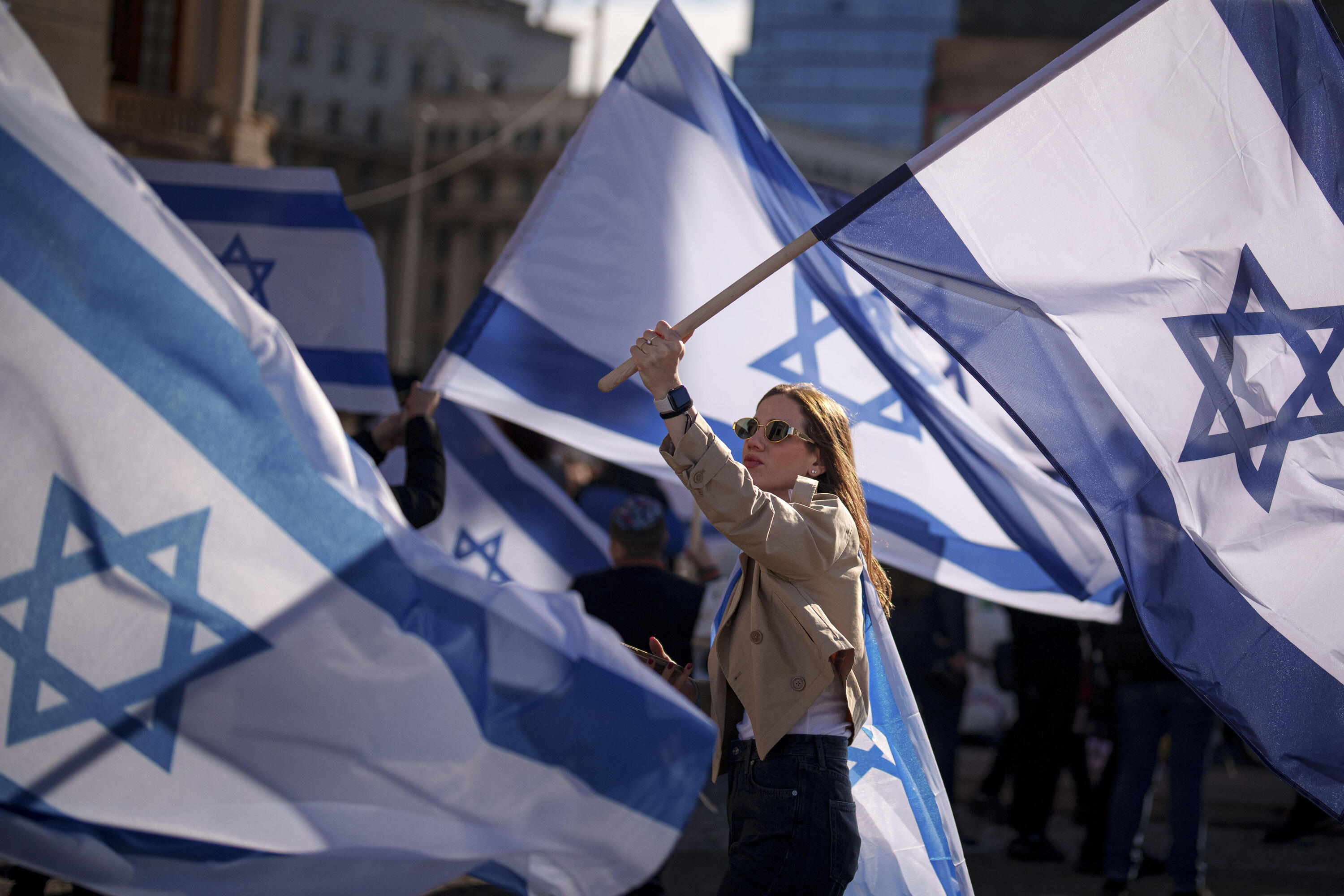 A woman holds an Israeli flag during a rally in solidarity with Israel and those held hostage by Hamas in Gaza in Bucharest, Romania, Sunday, November 12, 2023. (Photo by Andreea Alexandru/AP Photo)