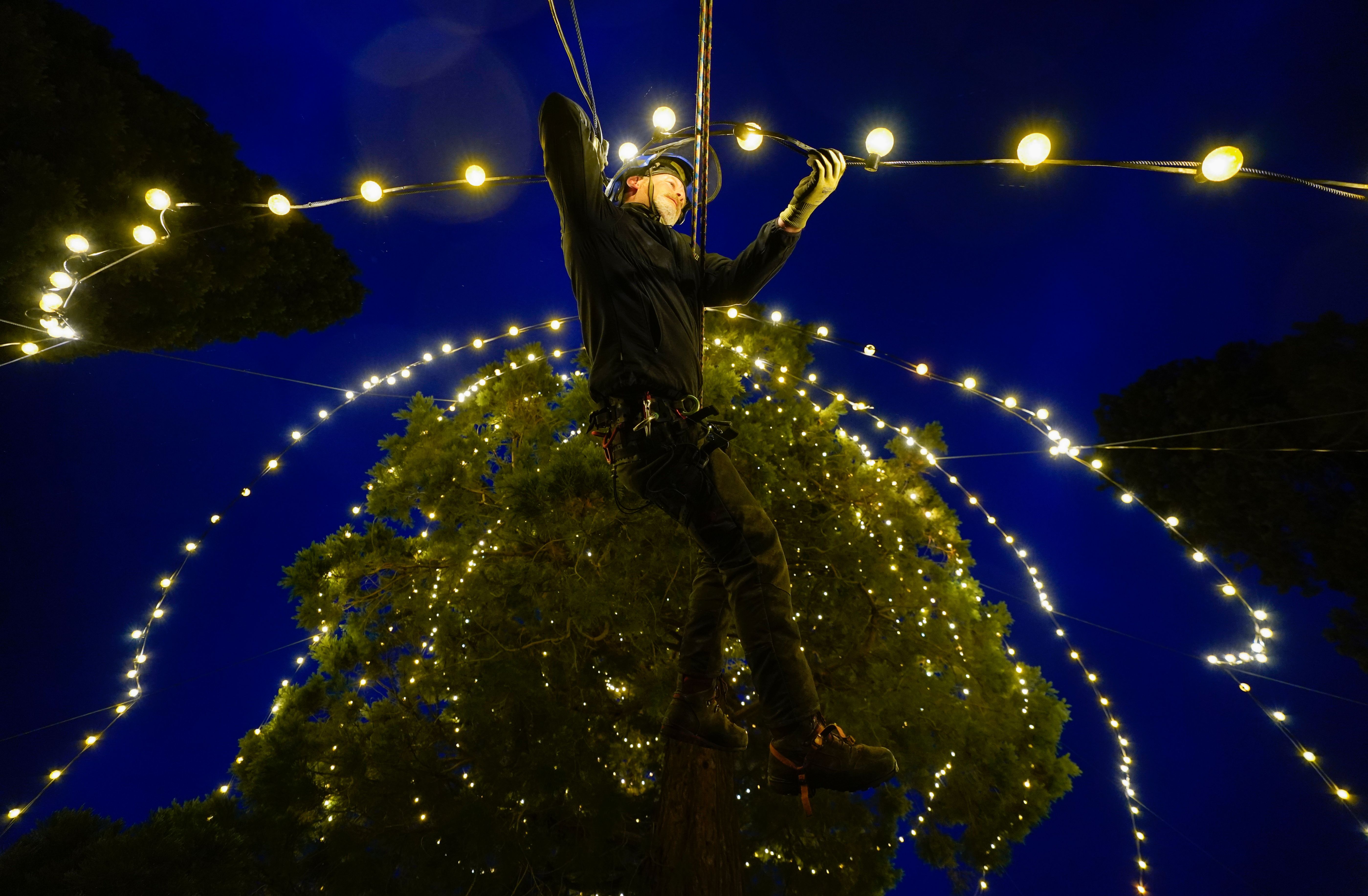 Russell Croft, Arboretum manager at Wakehurst, climbs the UK's tallest living Christmas tree on Wednesday, November 8, 2023, as he makes final checks to the 1,800 energy-saving bulbs that have been installed on the giant redwood tree ahead of the Glow Wild winter lantern trail which opens on November 23 at Wakehurst in Haywards Heath, West Sussex. (Photo by Andrew Matthews/PA Wire)