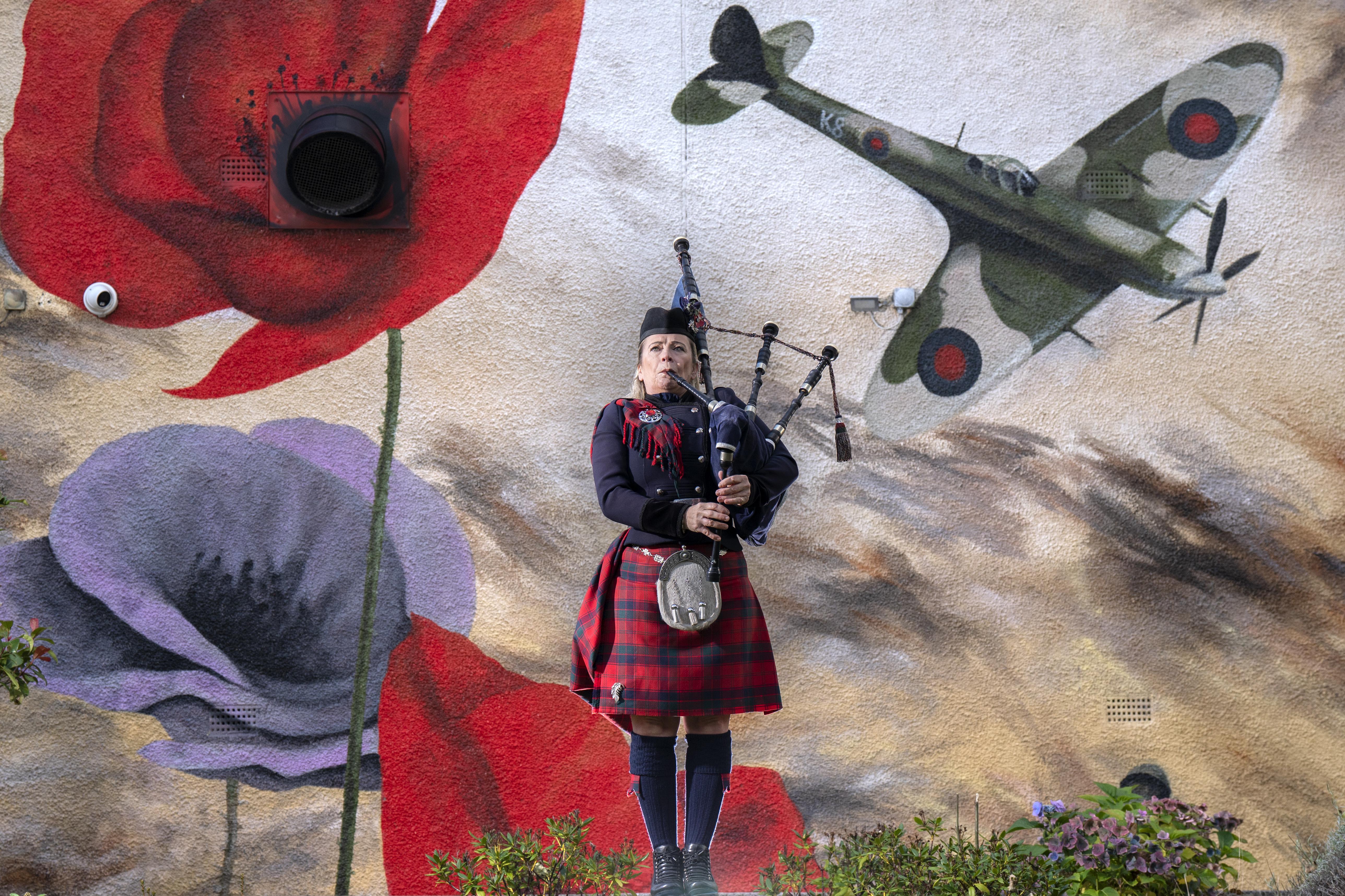 Scotland's national piper Louise Marshall plays alongside the Poppy Mural at the Kennoway Memorial Garden in Fife ahead of Remembrance Sunday on Tuesday, November 7, 2023. (Photo by Jane Barlow/PA Images via Getty Images)