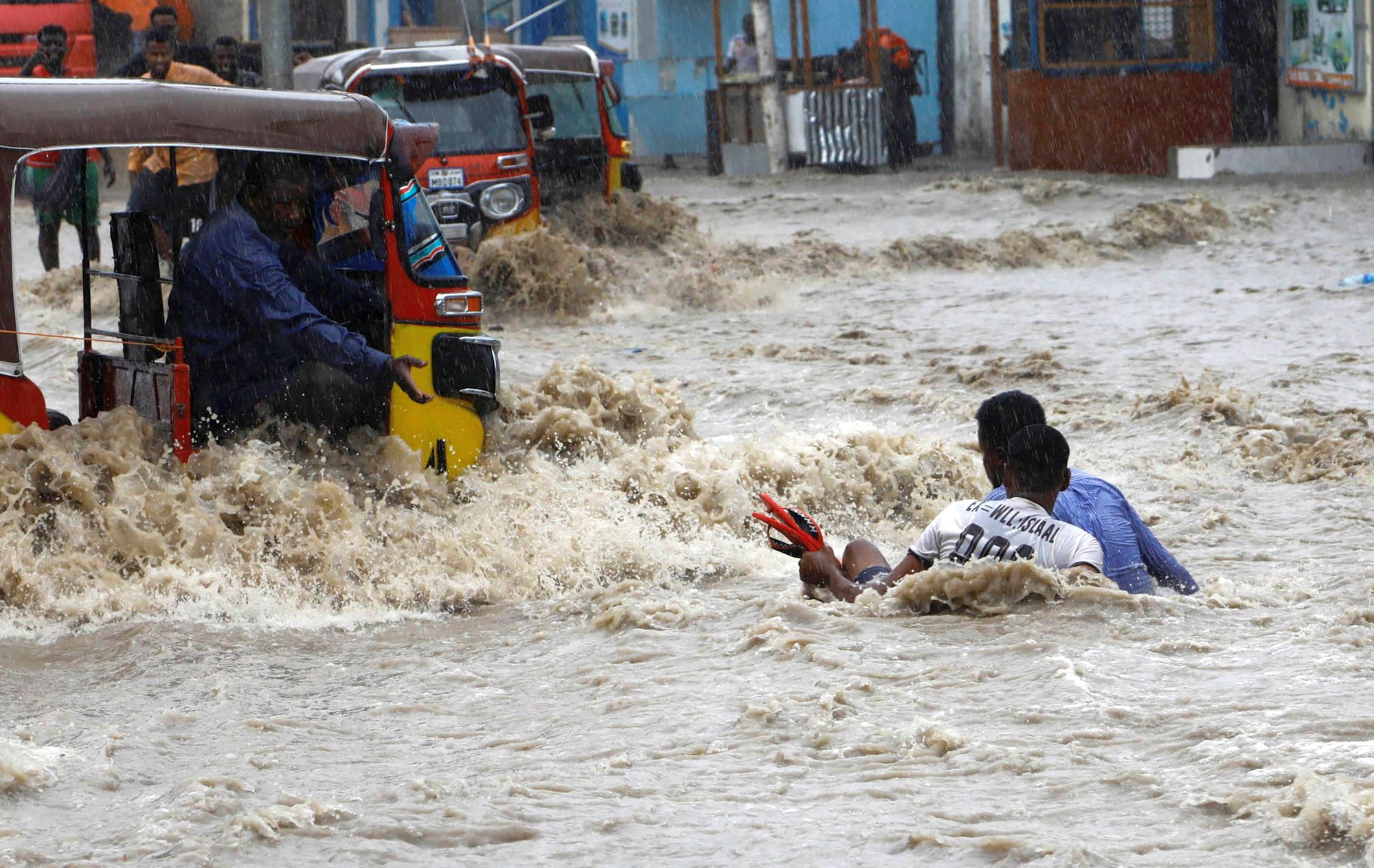 A man attempts to rescue a boy from raging flood waters following heavy rains in Mogadishu, Somalia on November 9, 2023. (Photo by Feisal Omar/Reuters)