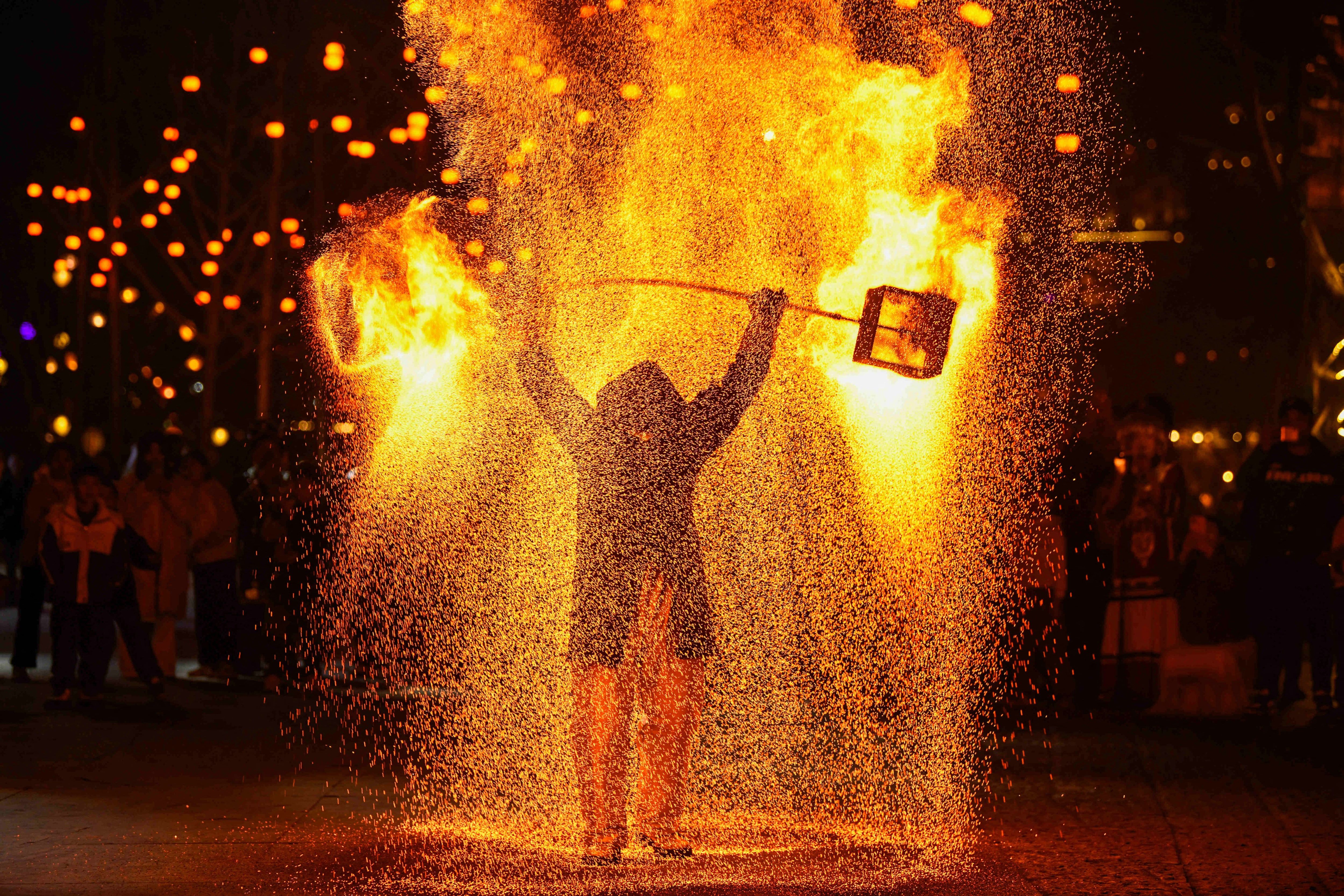 A folk performer sprays molten metal during a show in Xingyi, in China's southwest Guizhou province on January 22, 2025, in the buildup to celebrations of the Lunar New Year, which starts on January 29. (Photo by AFP Photo/China Stringer Network)