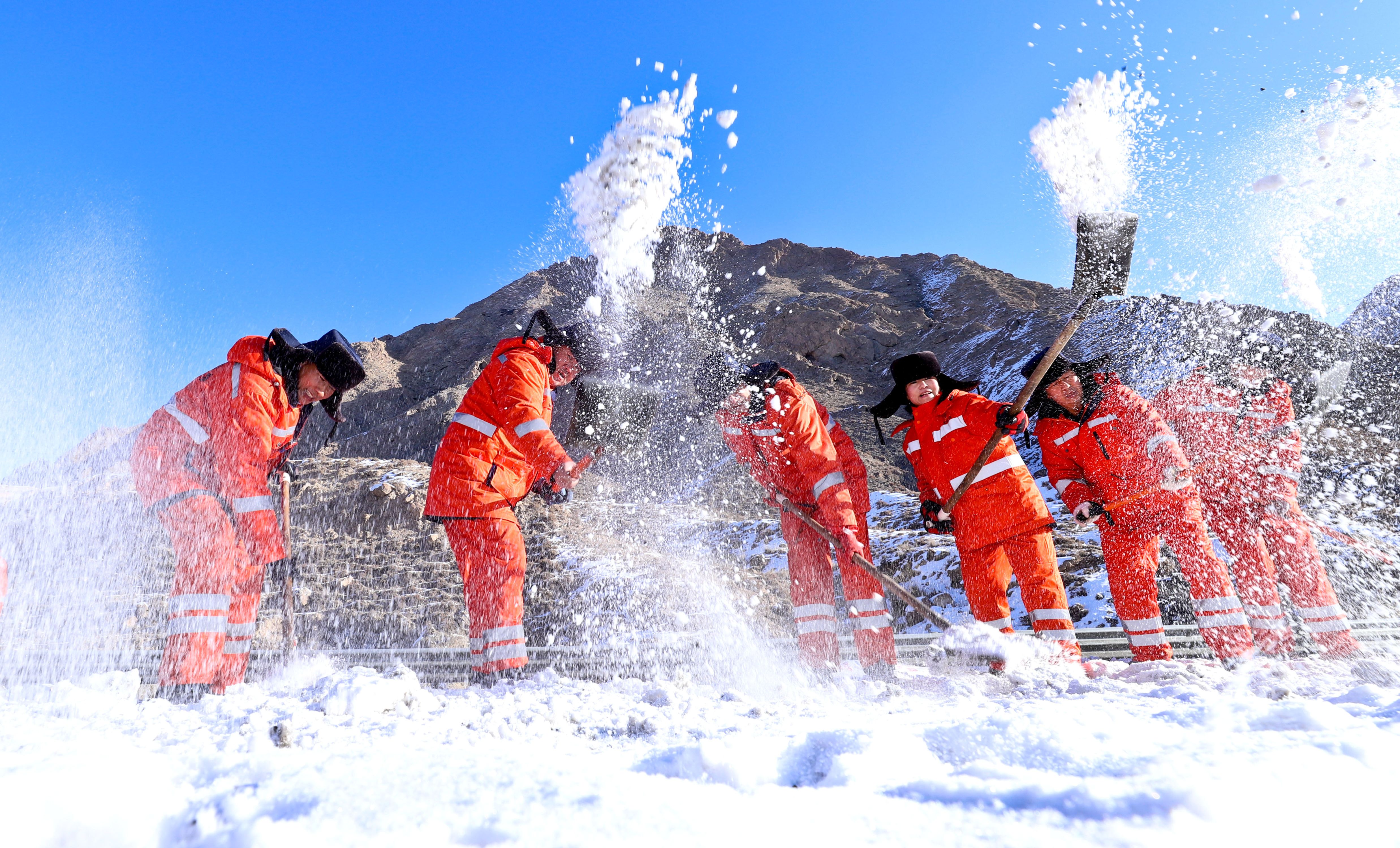 Road maintenance workers clear snow from the shoulder of a road in Zhangye, China, on January 28, 2025. (Photo by Costfoto/NurPhoto/Rex Features/Shutterstock)