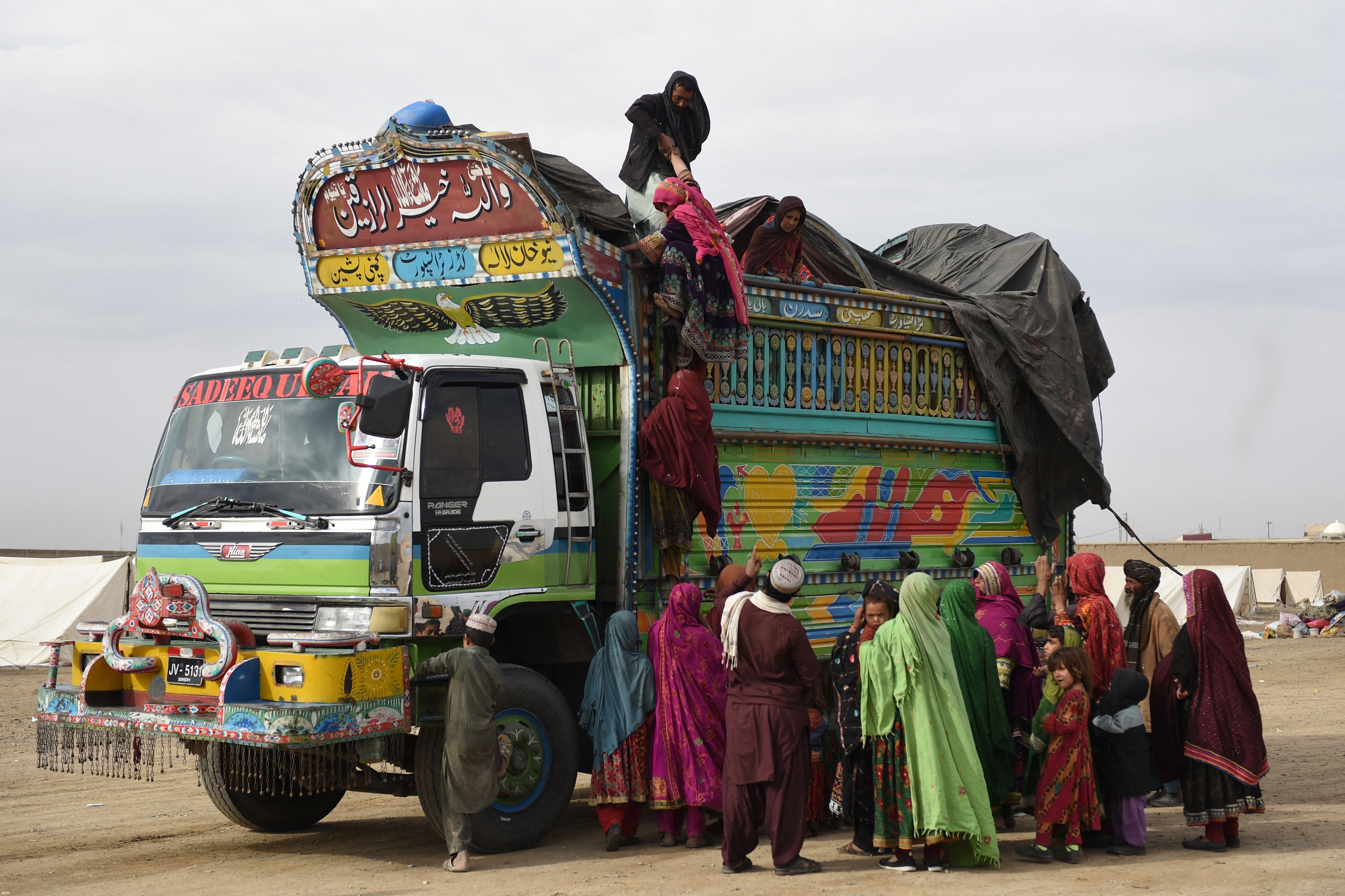 Afghan refugees climb on a truck to cross the Pakistan-Afghanistan border in Chaman on November 7, 2023, following Pakistan's government decision to expel people illegally staying in the country. More than 165,000 Afghans have fled Pakistan in the month since its government ordered 1.7 million people to leave or face arrest and deportation, officials said on November 2. (Photo by Banaras Khan/AFP Photo)