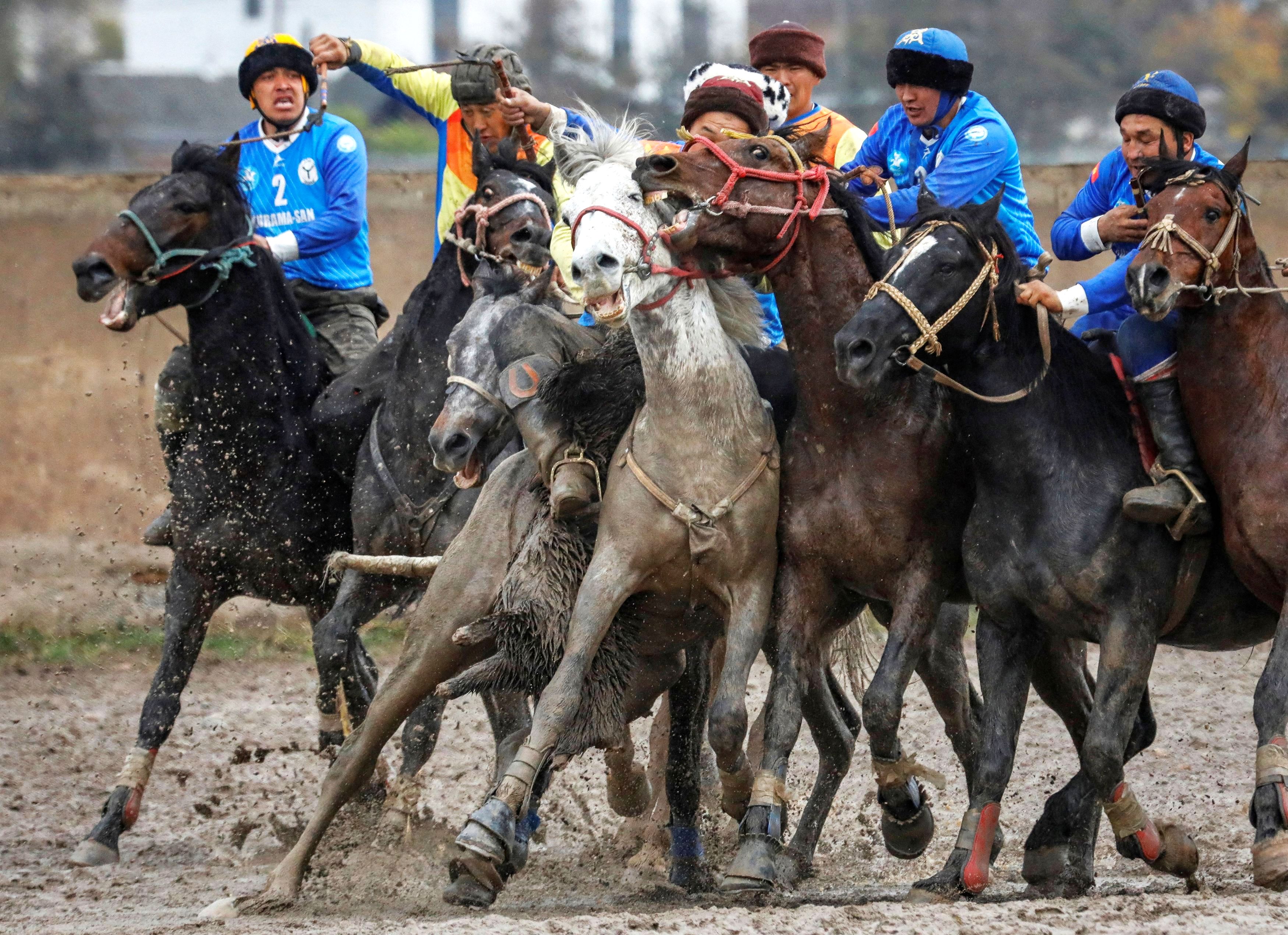Kyrgyz riders take part in Kok-Boru national championship in Bishkek, Kyrgyzstan, November 11, 2023. Kok-Boru is a traditional Central Asian game similar to polo, in which horsemen aim to drop the headless carcass of a goat in their opponents' goal. (Photo by Vladimir Pirogov/Reuters)