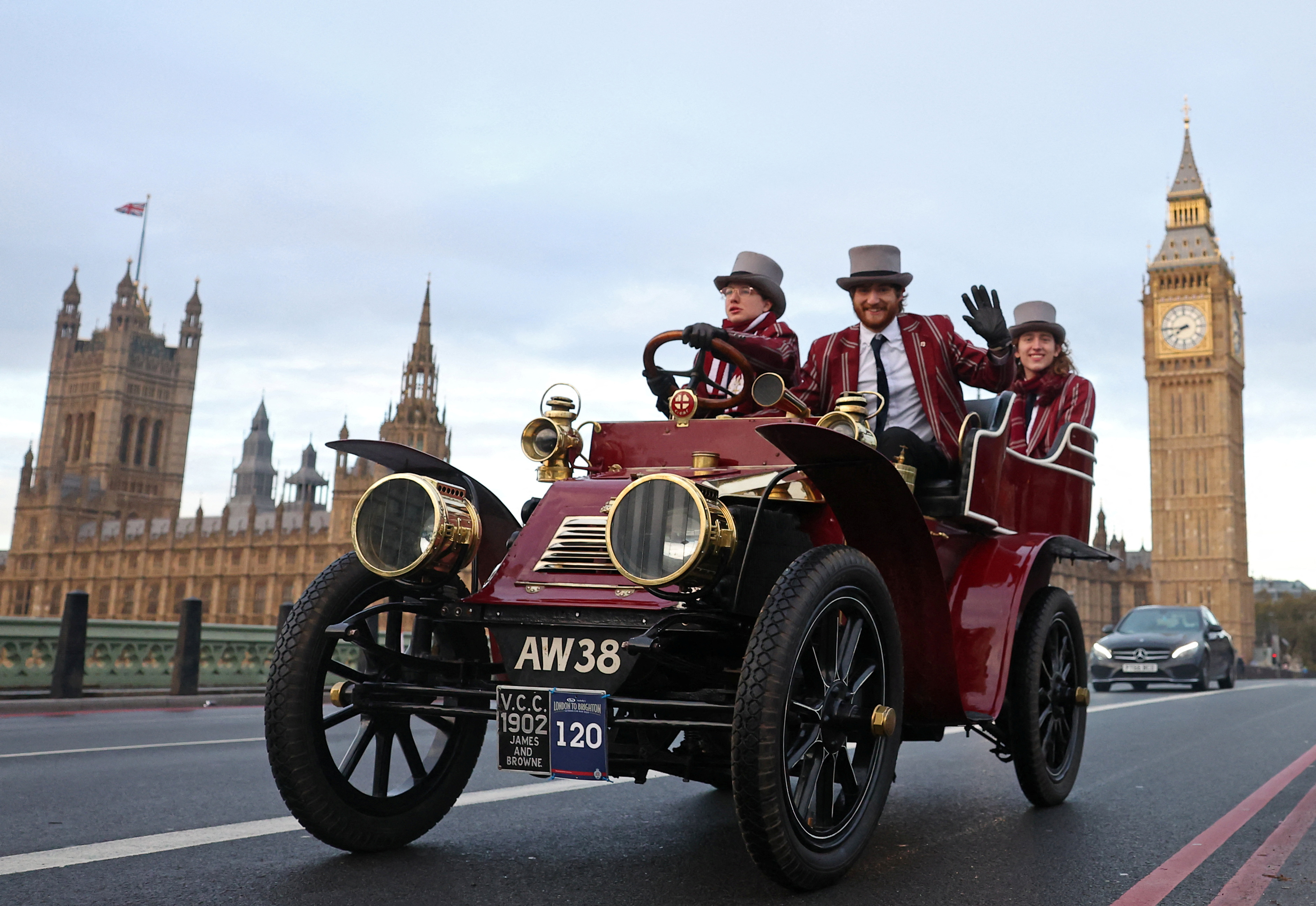 Participants drive over Westminster Bridge past the Houses of Parliament as they compete in the London to Brighton Veteran Car Run, for vehicles built before 1905, in London, Britain on November 5, 2023. (Photo by Toby Melville/Reuters)