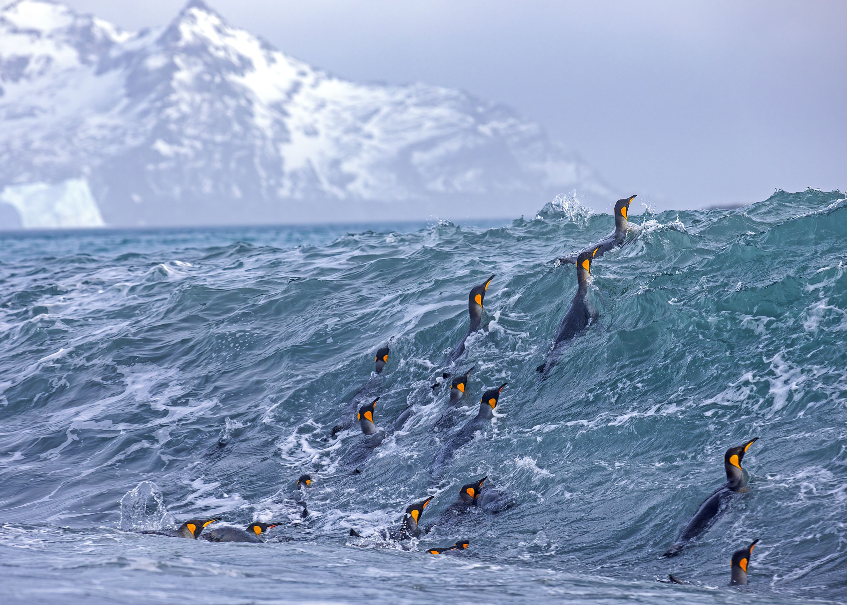 Thousands of penguins surf through the cold Atlantic waves in November 2023. The king penguins were heading out to sea to fish and clean themselves. Photo by Brian Matthews/Solent News)