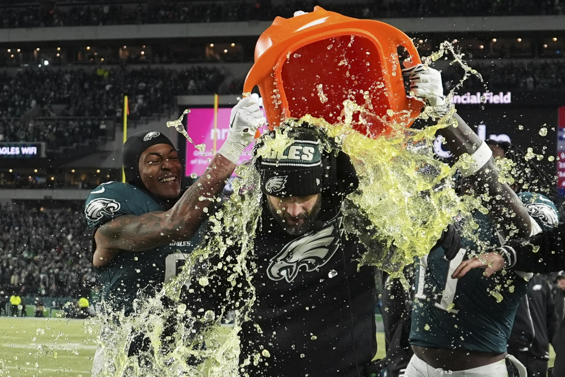 Philadelphia Eagles coach Nick Sirianni, center, is dunked during the closing minutes of the second half of the NFC Championship NFL football game against the Washington Commanders, Sunday, January 26, 2025, in Philadelphia. (Photo by Matt Slocum/AP Photo)