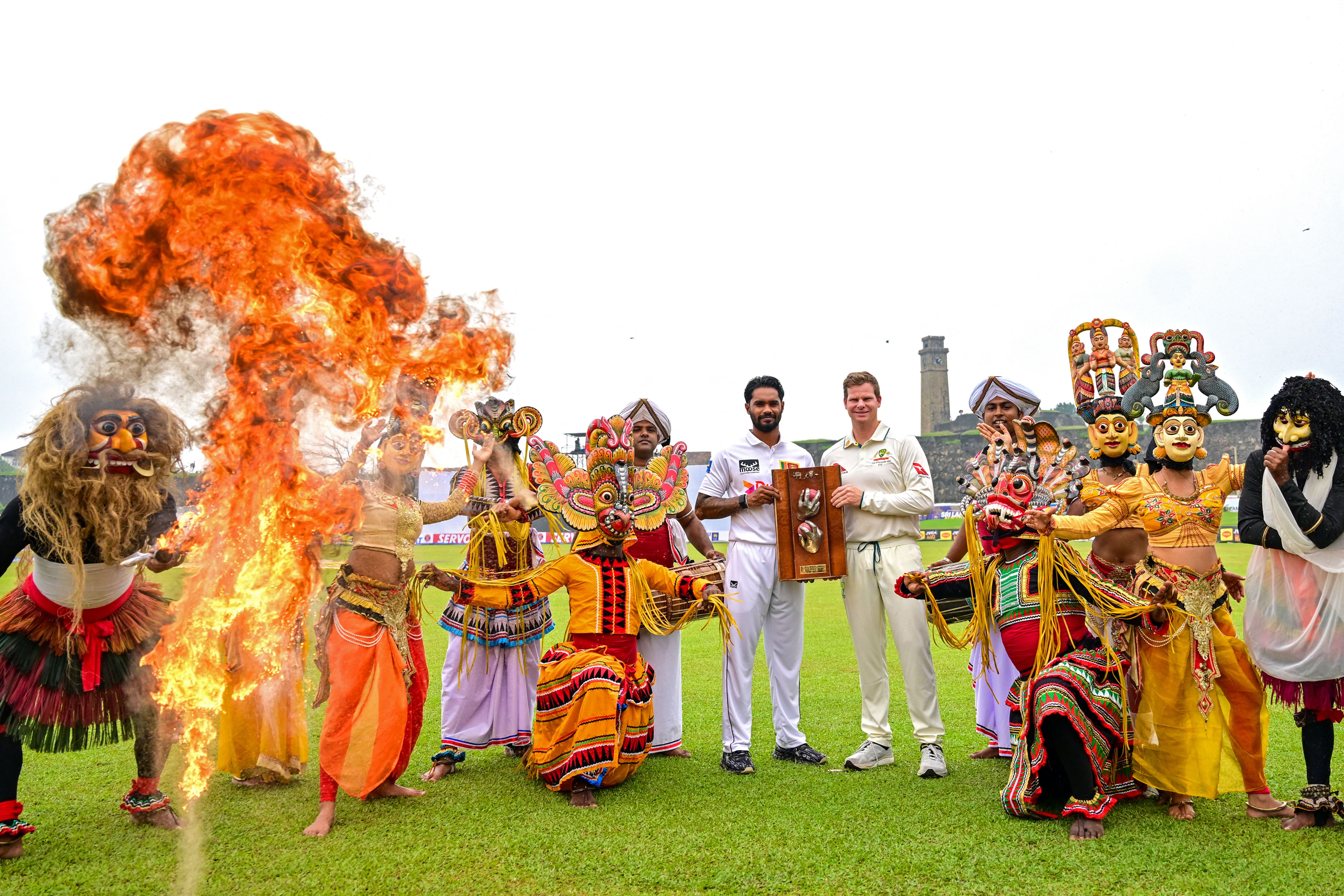 Sri Lanka's captain Dhananjaya de Silva (center L) and his Australian counterpart Steve Smith pose with the Warne-Muralitharan Test trophy at the Galle International Cricket Stadium in Galle on January 28, 2025, on the eve of their first Test cricket match between Sri Lanka and Australia. (Photo by Ishara S. Kodikara/AFP Photo)