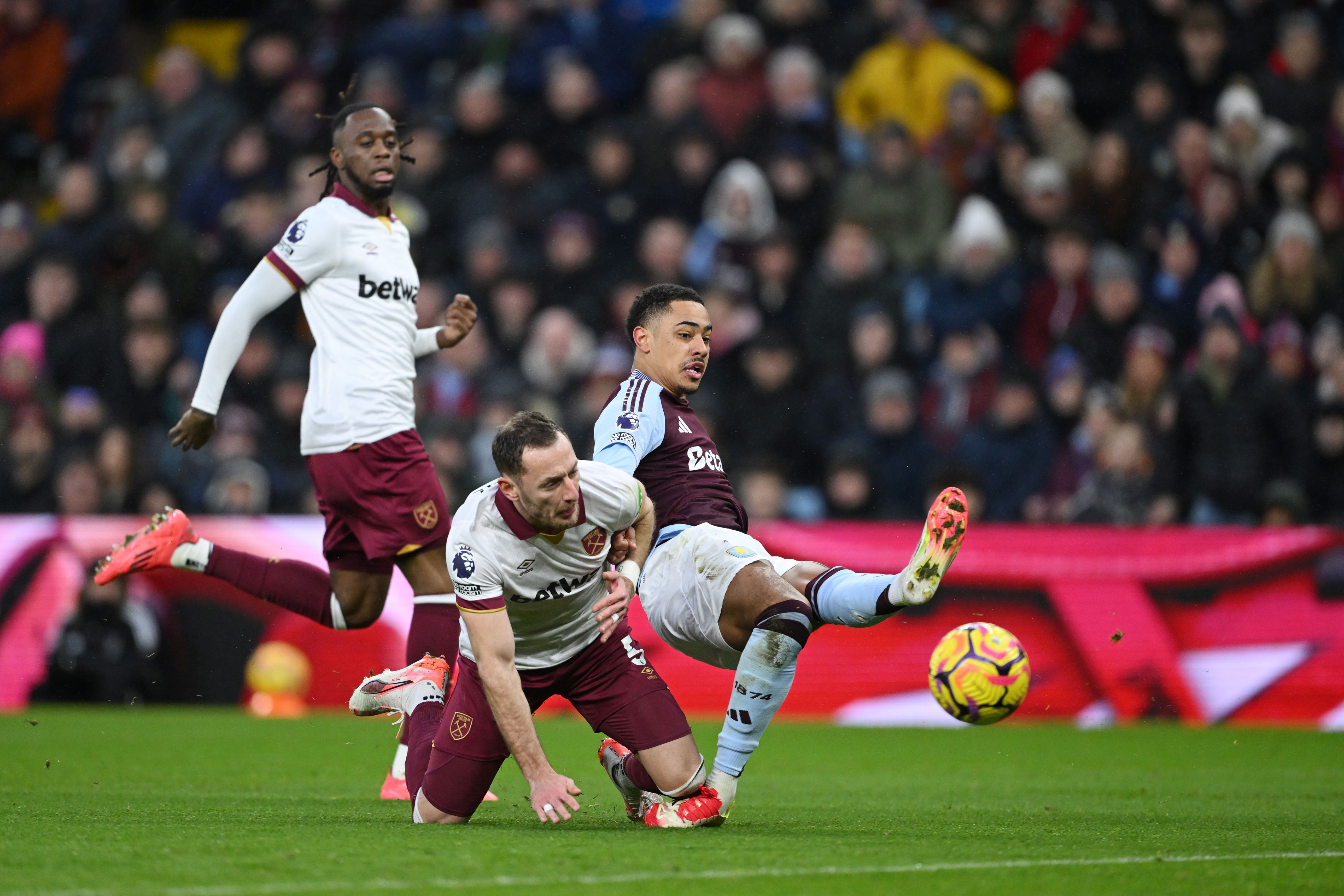 Jacob Ramsey of Aston Villa scores his team's first goal under pressure from Vladimir Coufal of West Ham United during the Premier League match between Aston Villa FC and West Ham United FC at Villa Park on January 26, 2025 in Birmingham, England. (Photo by Shaun Botterill/Getty Images)