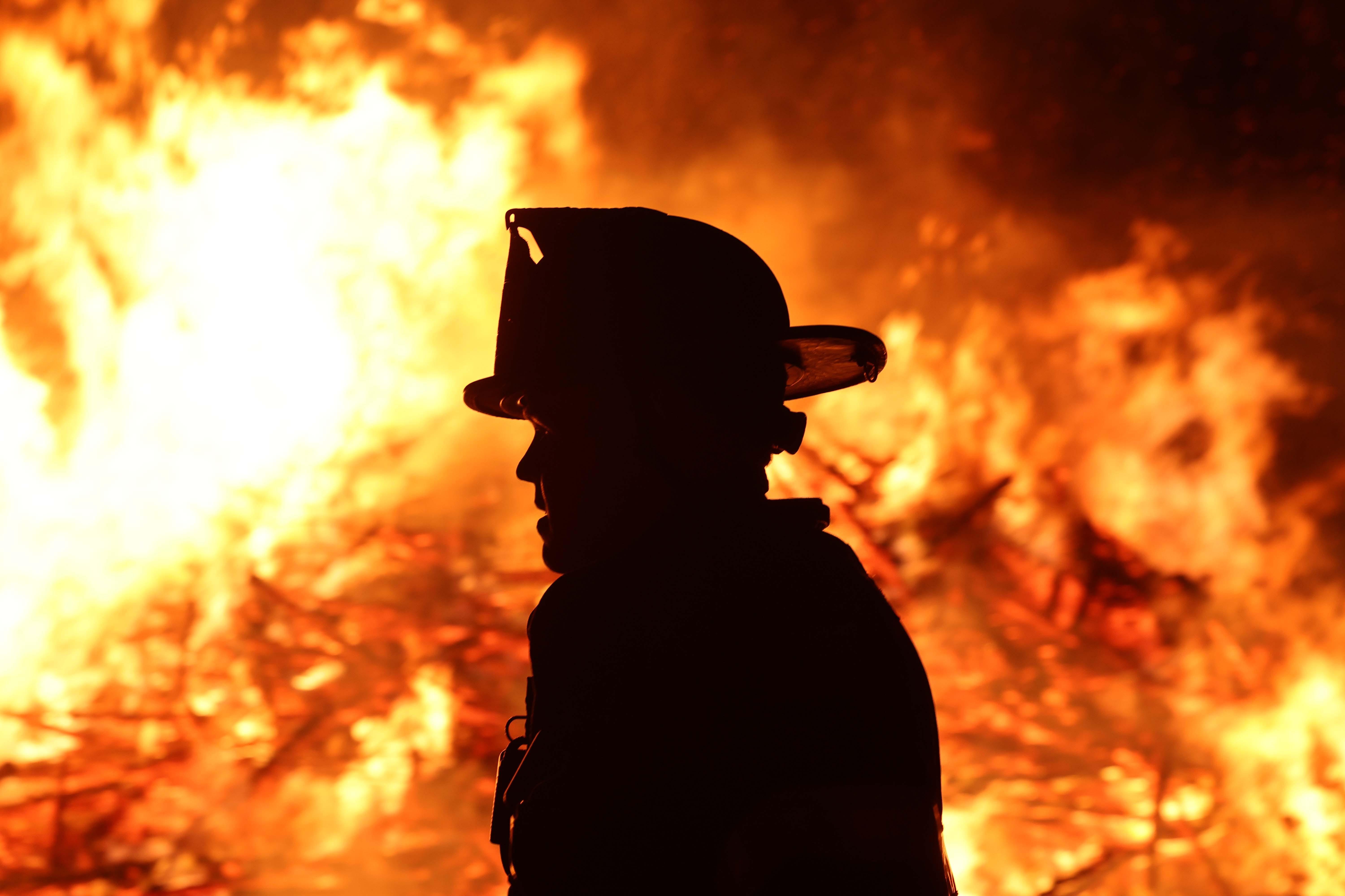 A firefighter walks passed Marblehead's annual Christmas tree bonfire at Riverhead Beach, Mass. on January 6, 2025. (Photo by USA Today)