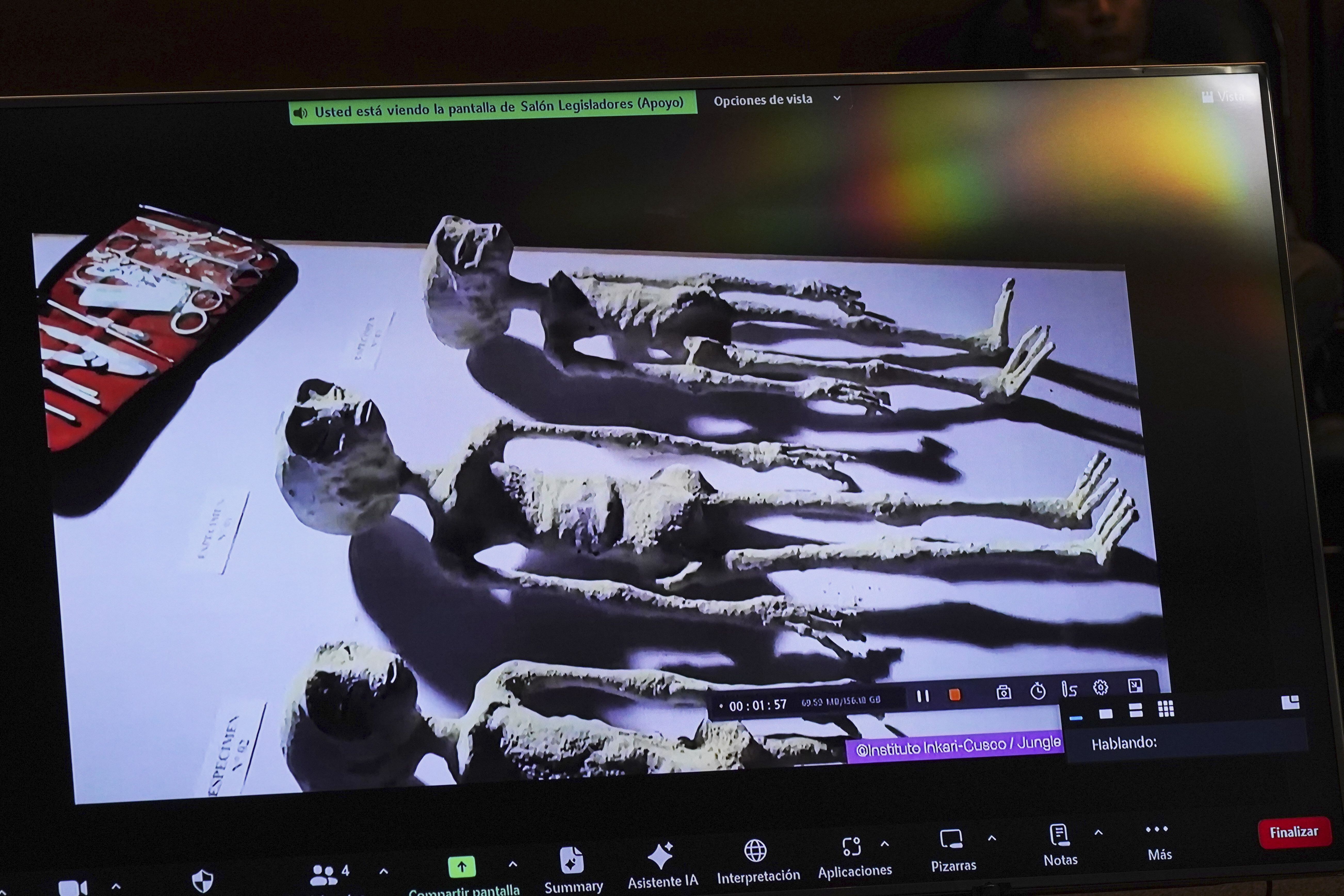 A screen shows what Mexican journalist Jaime Maussan claims are extraterrestrial life forms at the Chamber of Deputies in Mexico City, Tuesday, November 7, 2023. Mexican legislators held another hearing dedicated to the potential for extraterrestrial life forms and UFOs following a controversial spectacle in September in which Maussan displayed what he said were “non-human beings that are not part of our terrestrial evolution”. (Photo by Marco Ugarte/AP Photo)