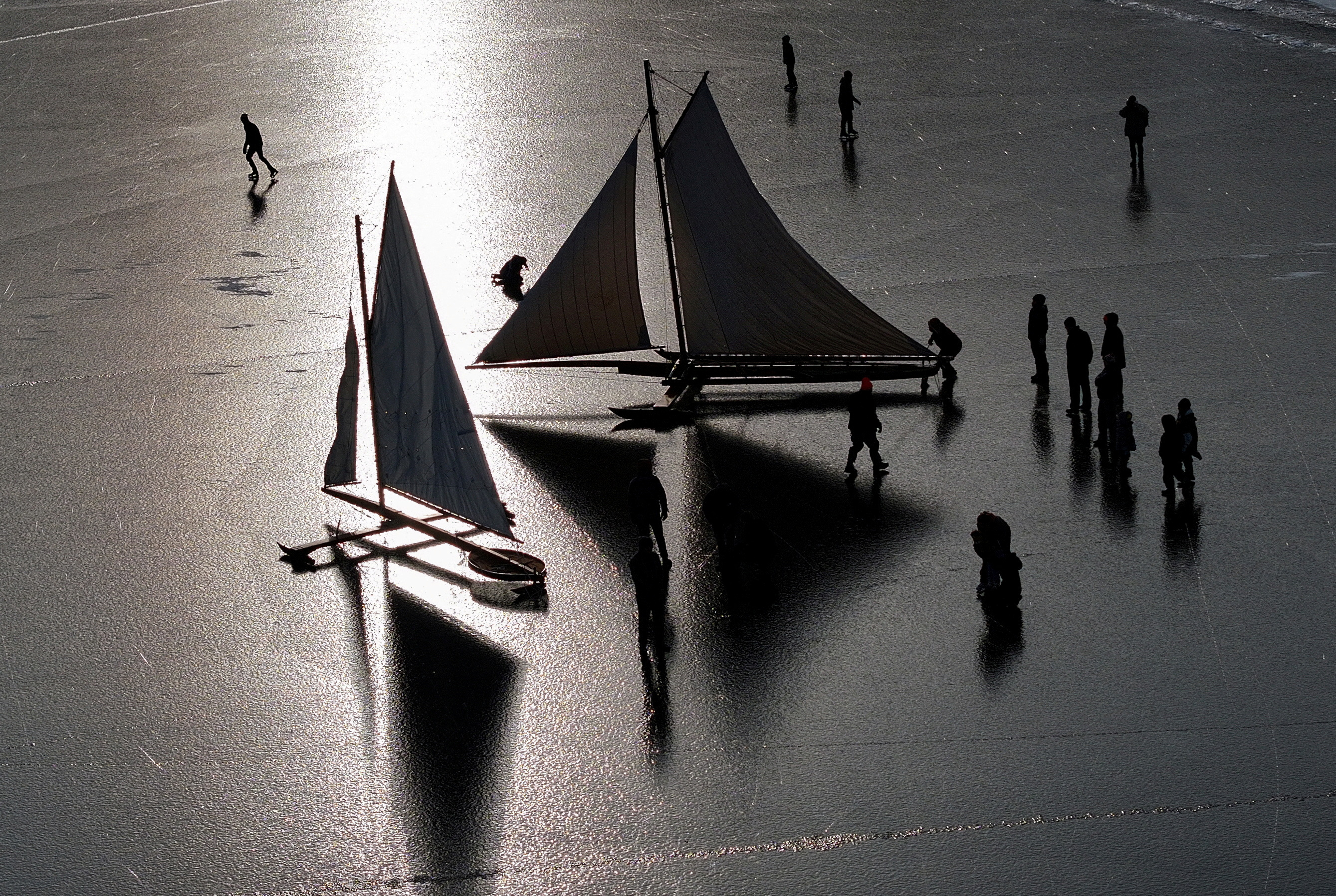 A drone view shows antique wooden ice sailing yachts, built during the late 1800s, maintained and sailed by members of the Hudson River Ice Yacht Club, as they prepare to sail on the frozen Hudson River near Athens, New York, U.S. January 25, 2025. (Photo by Mike Segar/Reuters)