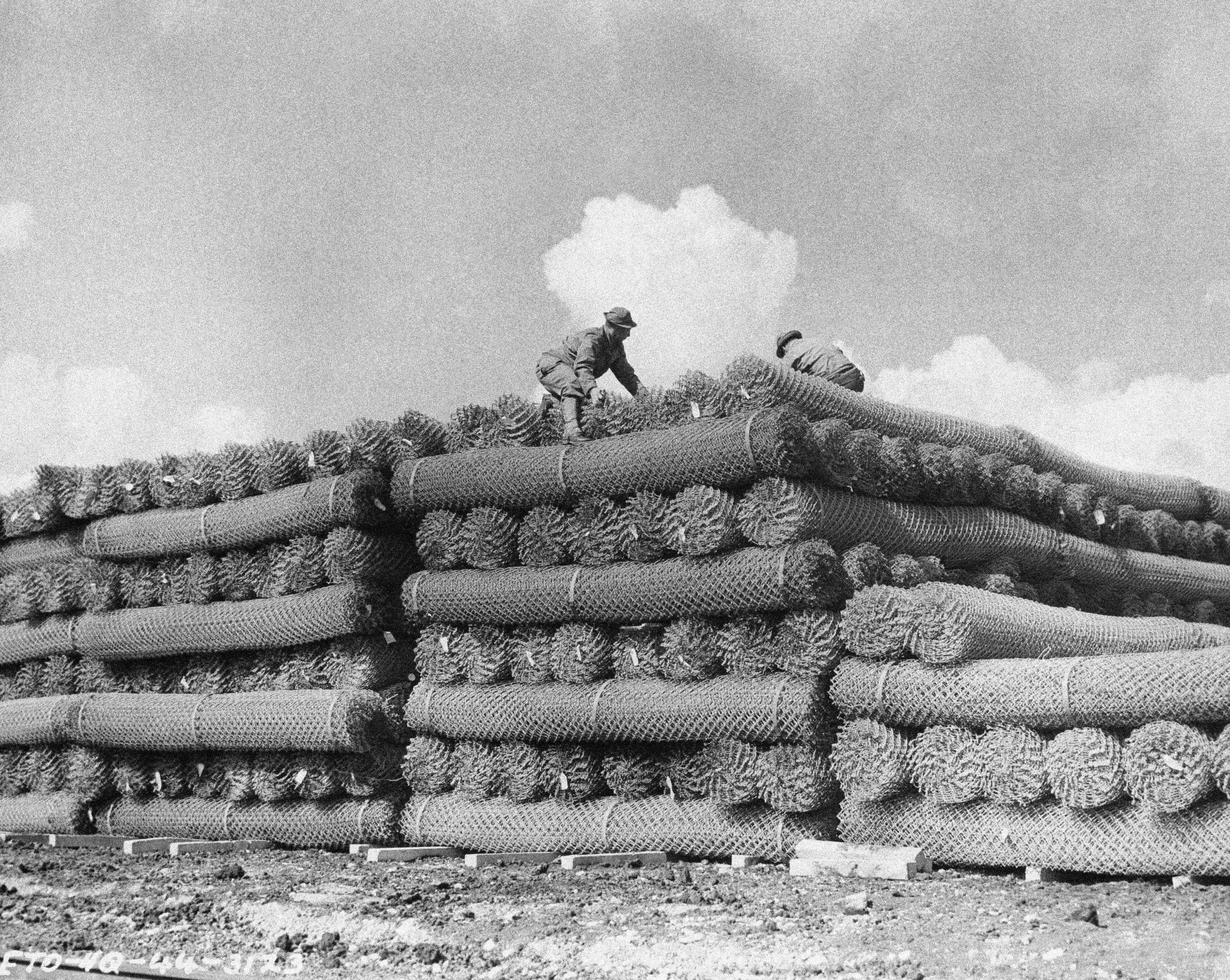 U.S. soldiers pile huge rolls of wire fence at an army supply depot for the coming invasion of the European continent in England, May 15, 1944. Equipment for invasion use has been piling up at ordnance depots all over England. (Photo by AP Photo)