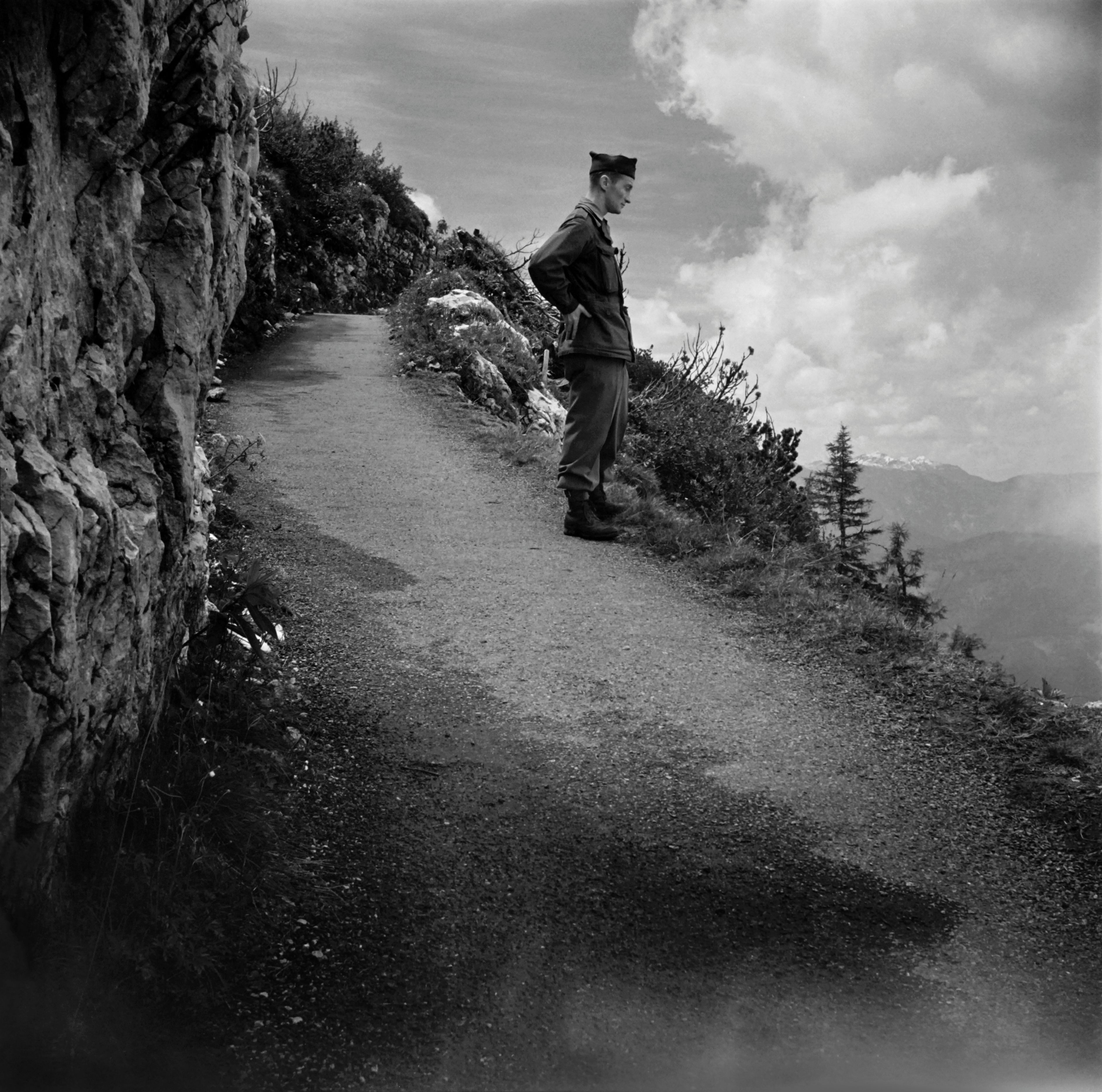 Photo taken on May 4, 1945 shows a US soldier on the way to the Berghof, Adolf Hitler's home, in the Obersalzberg of the Bavarian Alps near Berchtesgaden, Bavaria. Rebuilt, much expanded and renamed in 1935, the Berghof was Hitler's vacation residence for ten years. In late April 1945 the house was damaged by British aerial bombs, set on fire by retreating SS troops in early May, and looted after Allied troops reached the area. The Bavarian government demolished the burnt shell in 1952. (Photo by Eric Schwab/AFP Photo)