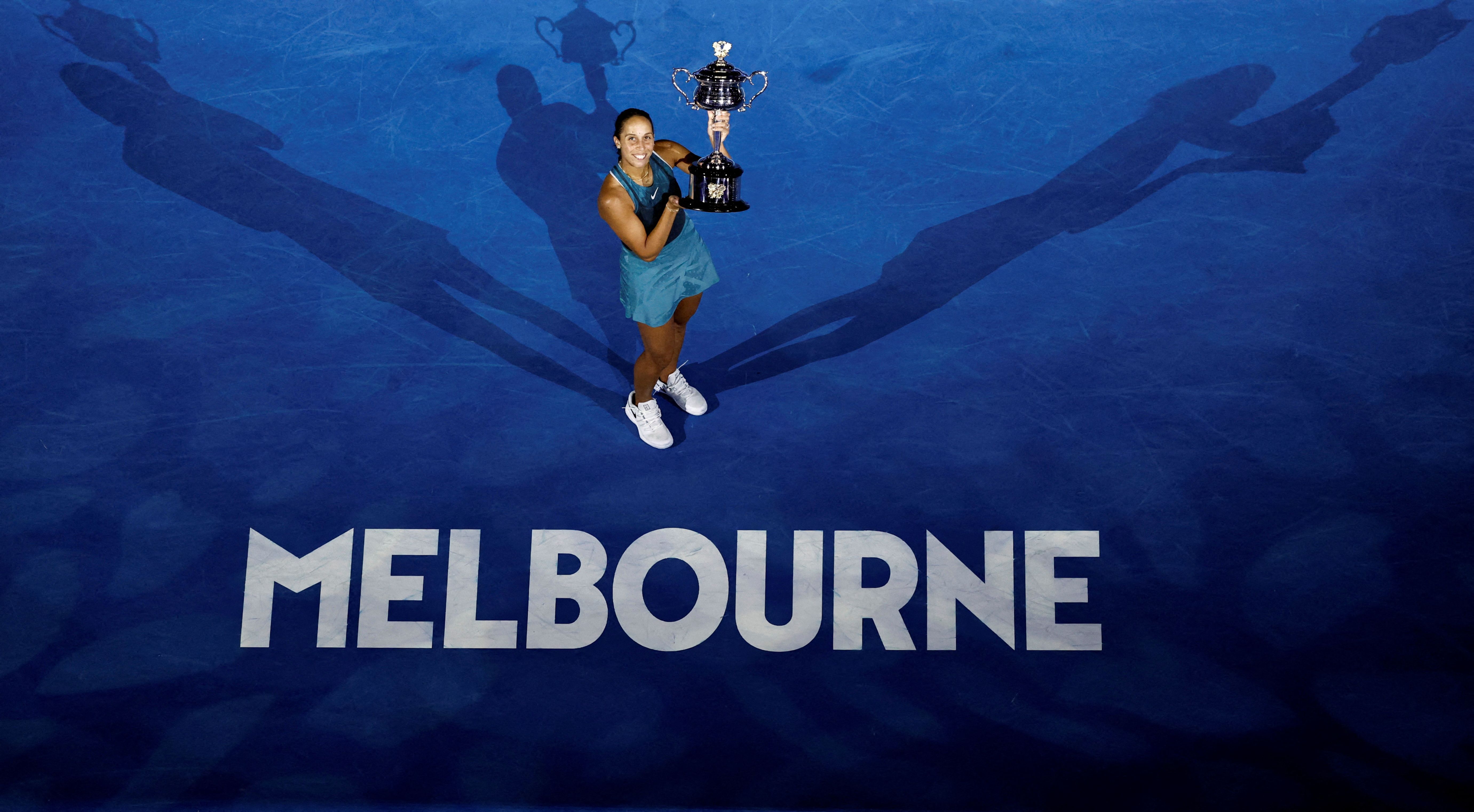 Madison Keys of the U.S. celebrates with the trophy after winning the final against Belarus' Aryna Sabalenka at the Australian Open in Melbourne, on January 25, 2025. (Photo by Tingshu Wang/Reuters)