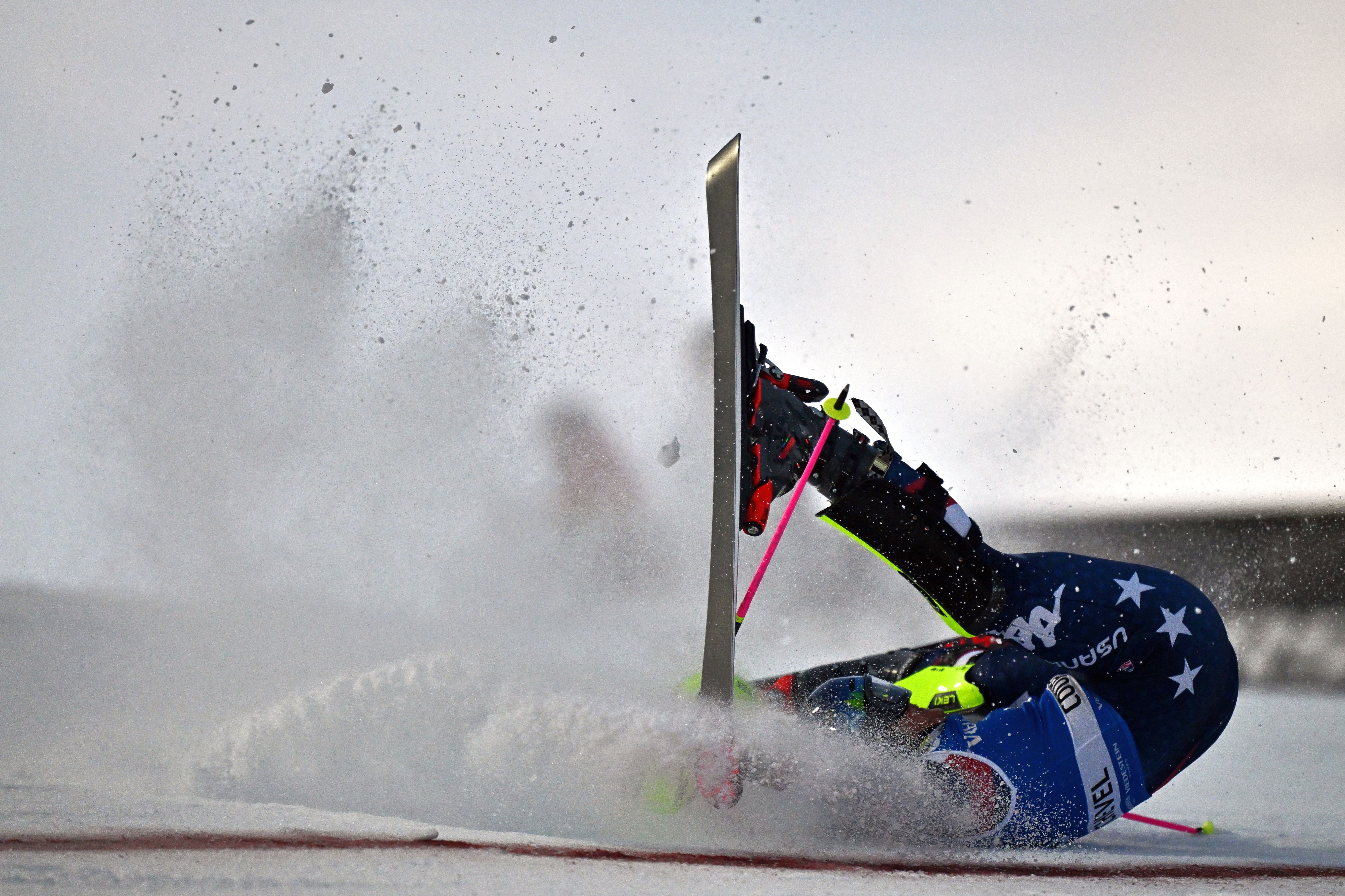 USA's Paula Moltzan falls down as she competes in the first run of the women's Slalom of the FIS Alpine Skiing 2024/2025 World Cup event in Courchevel, French Alps, on January 30, 2025. (Photo by Jeff Pachoud/AFP Photo)