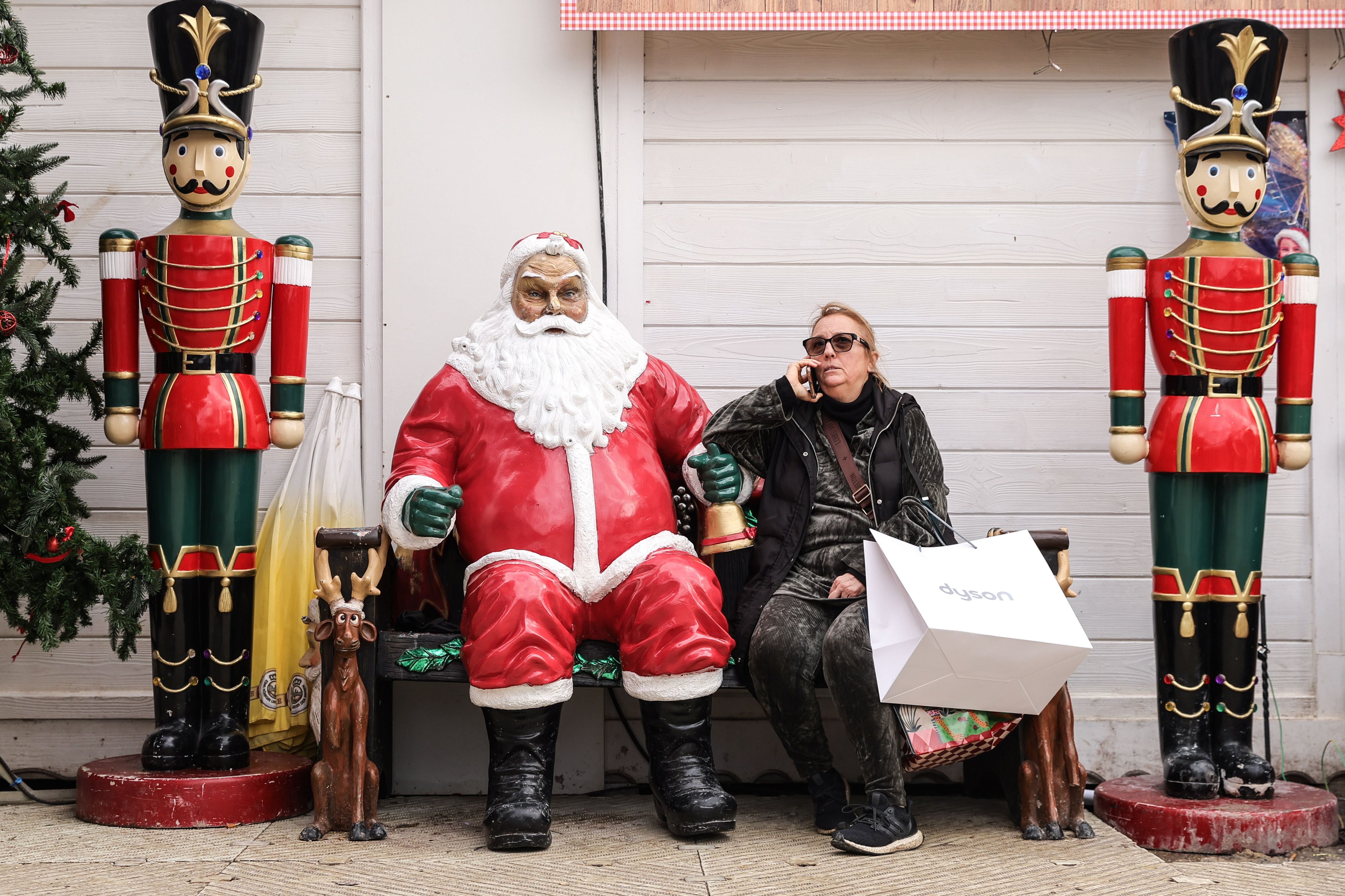 A woman rests with her shopping bags near a Santa Claus statue at the Christmas market in the Tuileries Garden in Paris, France, 23 December 2023. The market opened to the public on 18 November 2023 and runs through 07 January 2024. (Photo by Teresa Suarez/EPA)