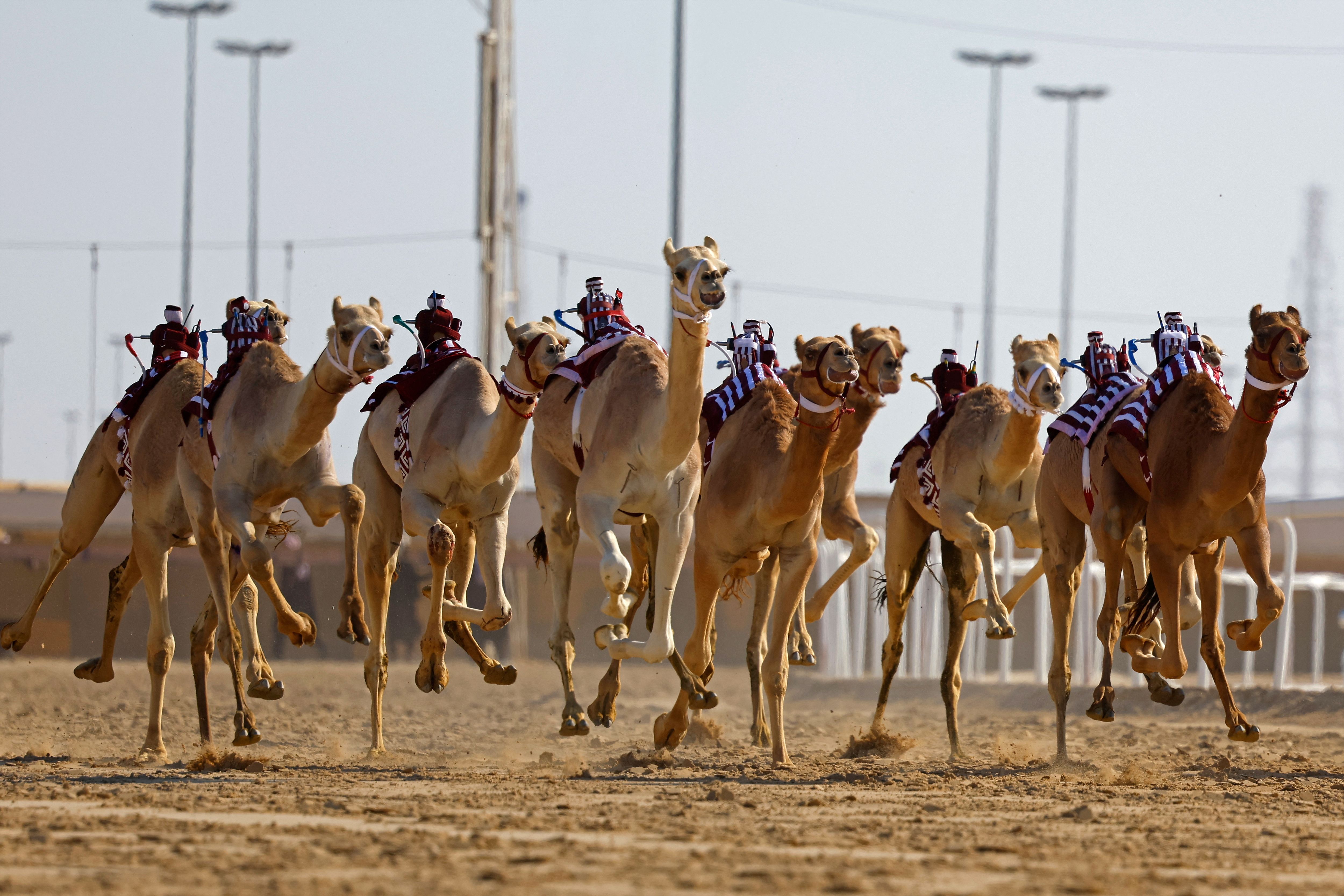 Camels equipped with robot jockeys race during an event organised by the Qatar Camel Racing Organising Committee in Al-Shahaniya, about 40km west of Doha, on January 22, 2025. (Photo by Karim Jaafar/AFP Photo)