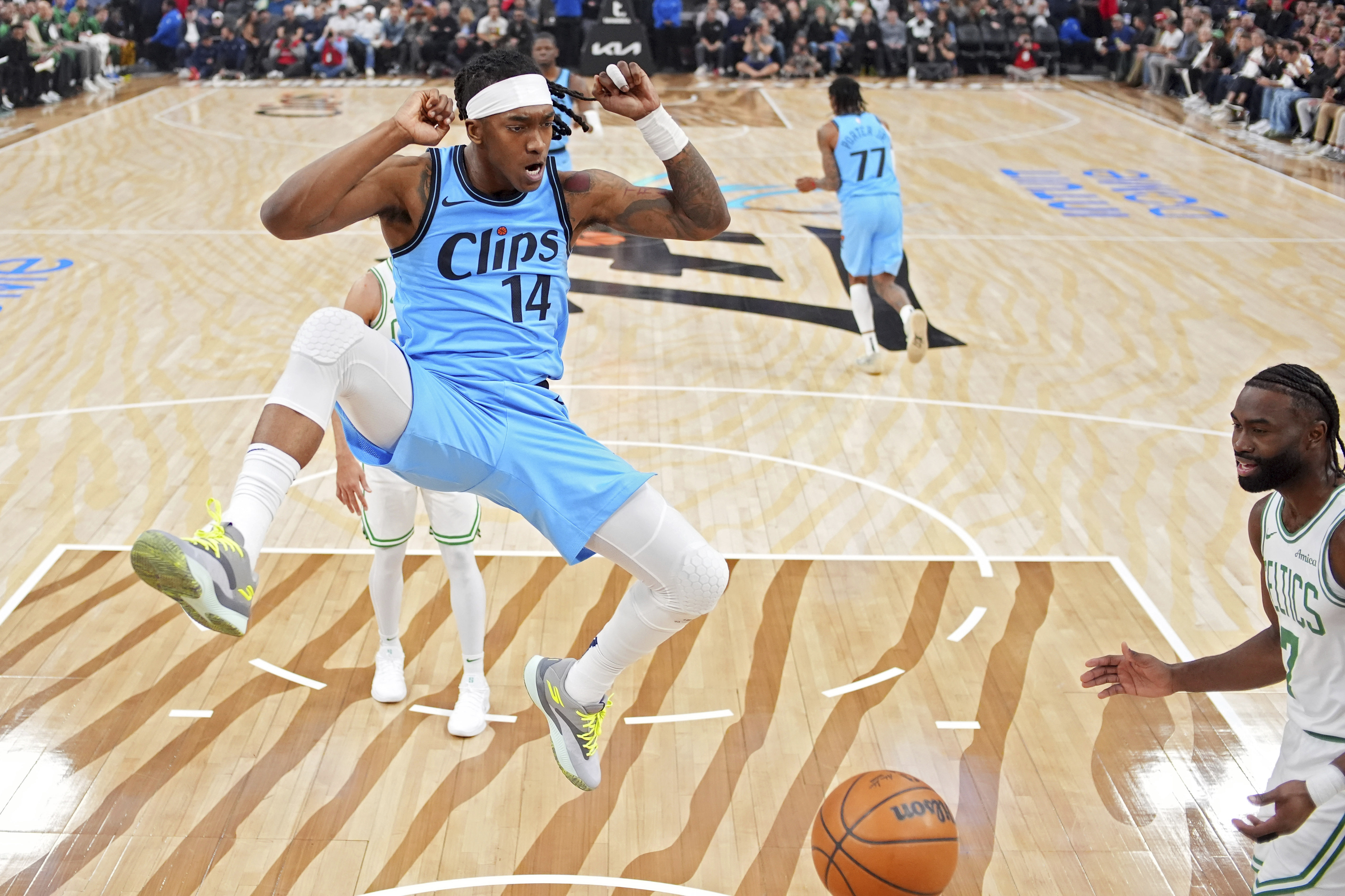 Los Angeles Clippers guard Terance Mann, left, finishes his dunk as Boston Celtics guard Jaylen Brown stands by during the first half of an NBA basketball game, Wednesday, January 22, 2025, in Inglewood, Calif. (Photo by Mark J. Terrill/AP Photo)