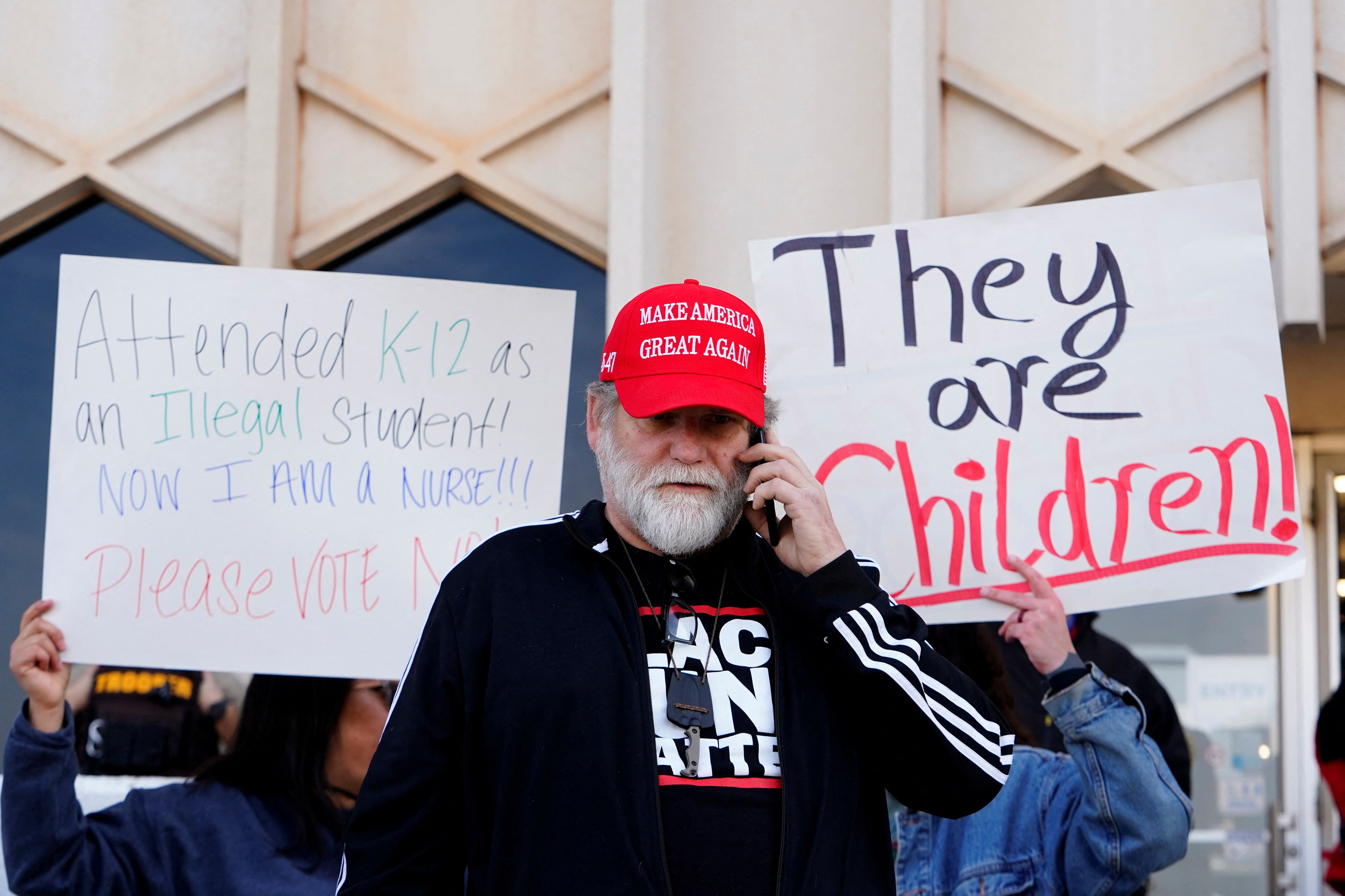 A supporter of U.S. President Donald Trump talks on his phone in front of protesters opposing possible Immigration and Customs Enforcement (ICE) raids in public schools outside the State Department of Education during their monthly board meeting in Oklahoma City, Oklahoma, U.S. January 28, 2025. (Photo by Nick Oxford/Reuters)