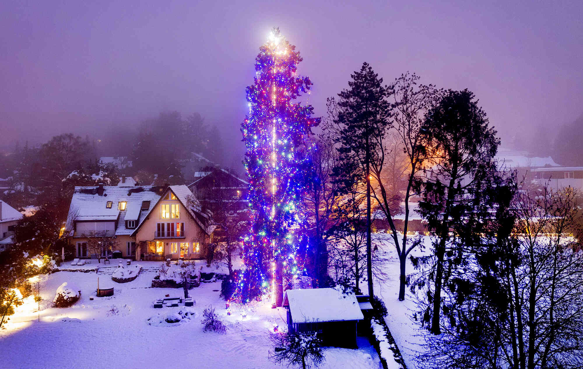 A giant Douglas fir is decorated with Christmas lights in a garden of a house in the small village of Falkenstein near Frankfurt, Germany, Tuesday, December 5, 2023. (Photo by Michael Probst/AP Photo)
