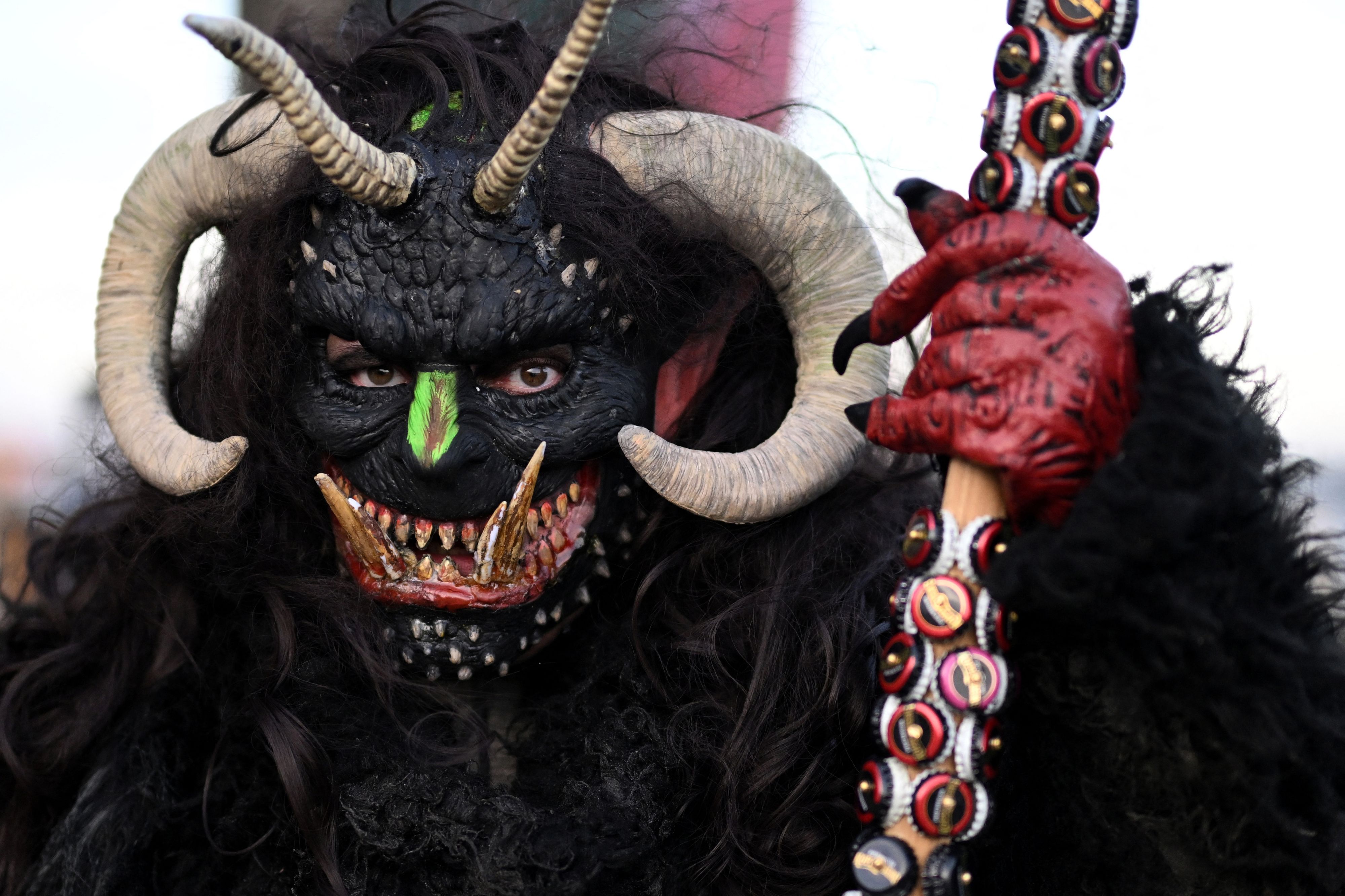 A participant dressed as “Krampus”, a half-goat, half-demon figure that punishes people who misbehave during the Christmas season, takes part in “The Whitby Krampus Run” in Whitby, north east England on December 2, 2023. (Photo by Oli Scarff/AFP Photo)