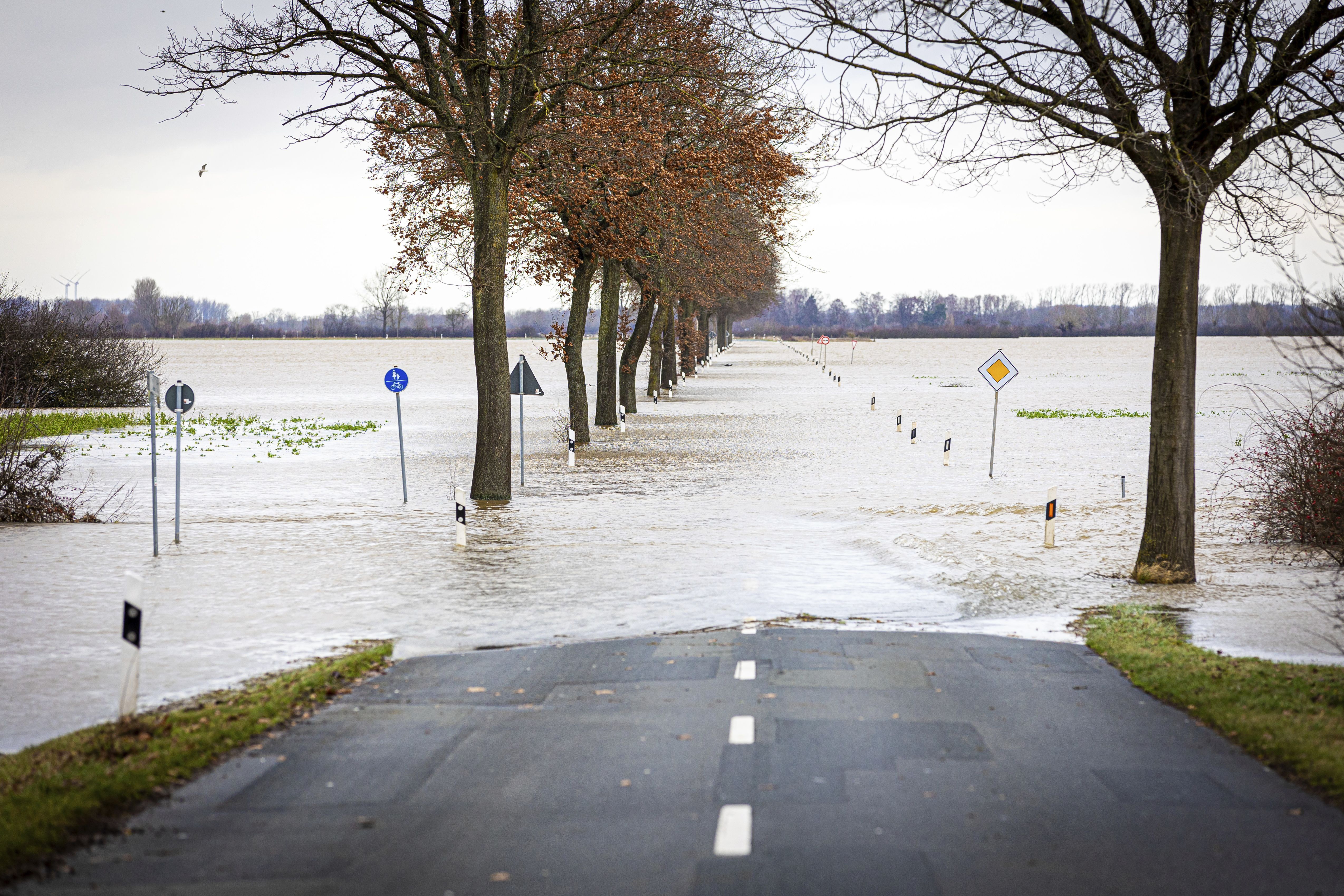 A road in the district of Nienburg-Weser is flooded in Drakenburg, Germany, Thursday, December 28, 2023. Parts of northern Germany are continuing to grapple with flooding as rivers remain swollen after heavy rain. (Photo by Moritz Frankenberg/dpa via AP Photo)