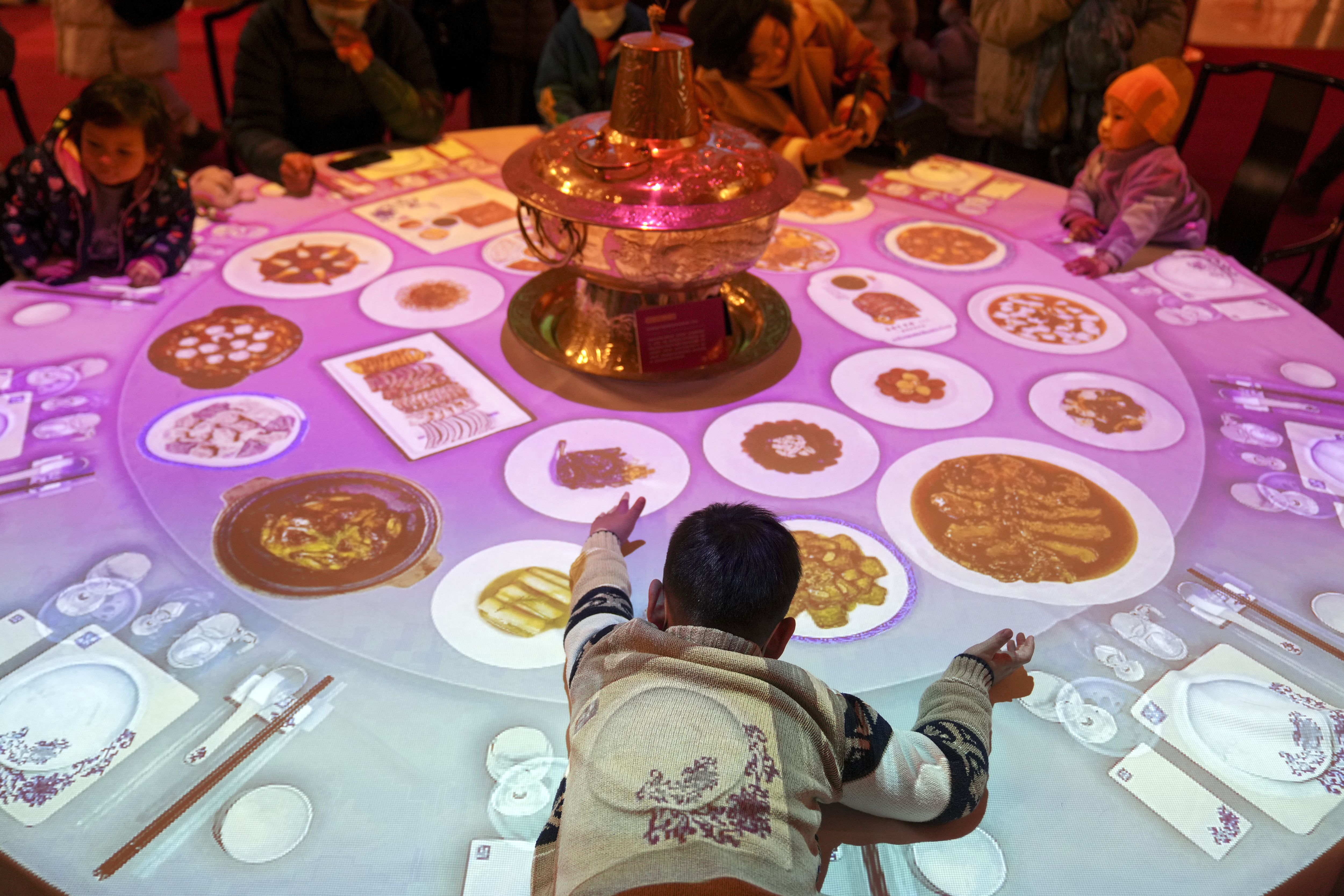 A child reaches to projected dishes on a steamboat table at an exhibition for the upcoming Lunar New Year, in Beijing, Tuesday, January 14, 2025. (Photo by Andy Wong/AP Photo)