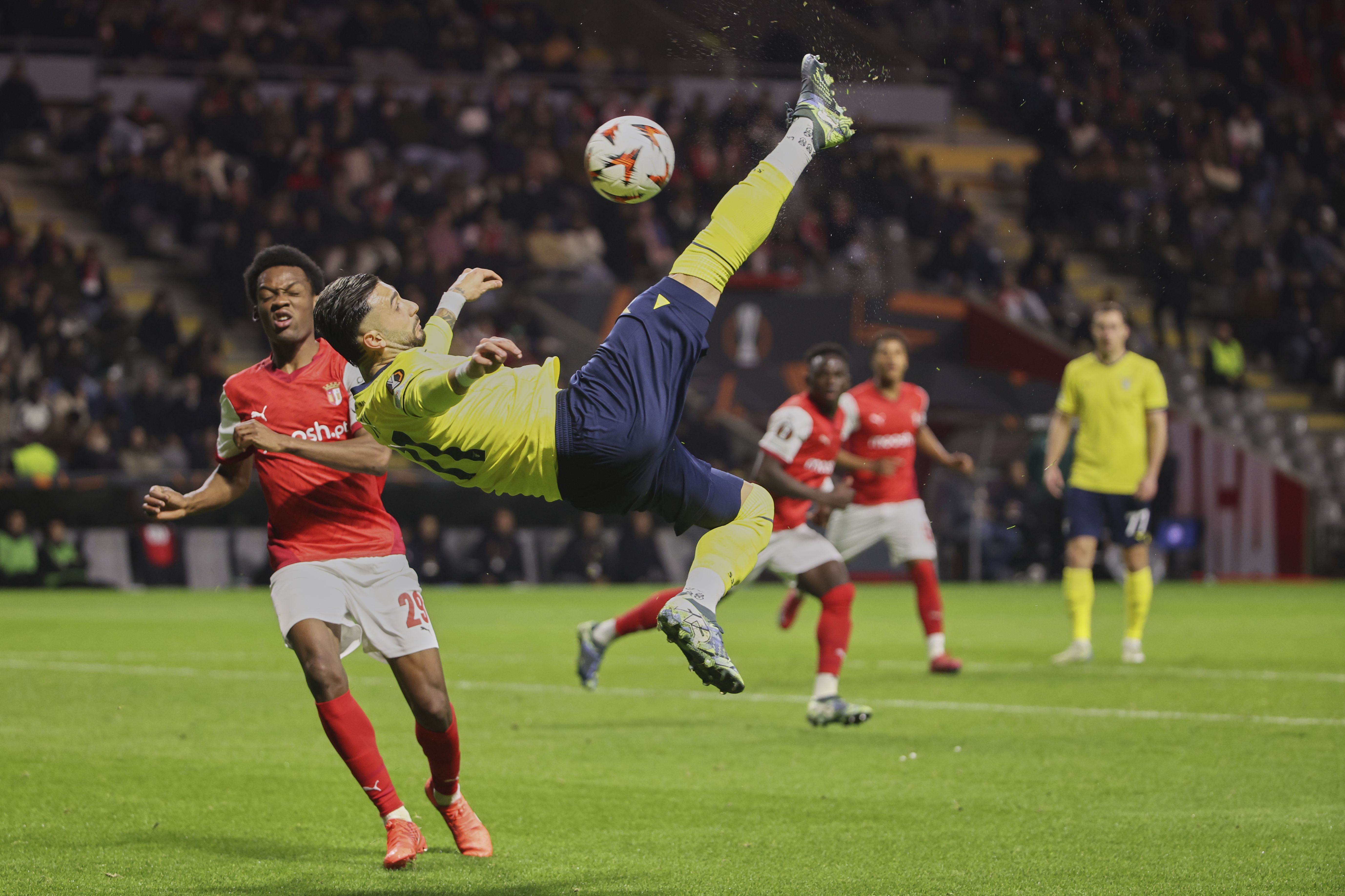 Lazio's Taty Castellanos in action with a bicycle kick in front of Braga's Jean-Baptiste Gorby during the Europa League opening phase soccer match between SC Braga and Lazio at the Municipal stadium in Braga, Portugal, Thursday, January 30, 2025. (Photo by Luis Vieira/AP Photo)