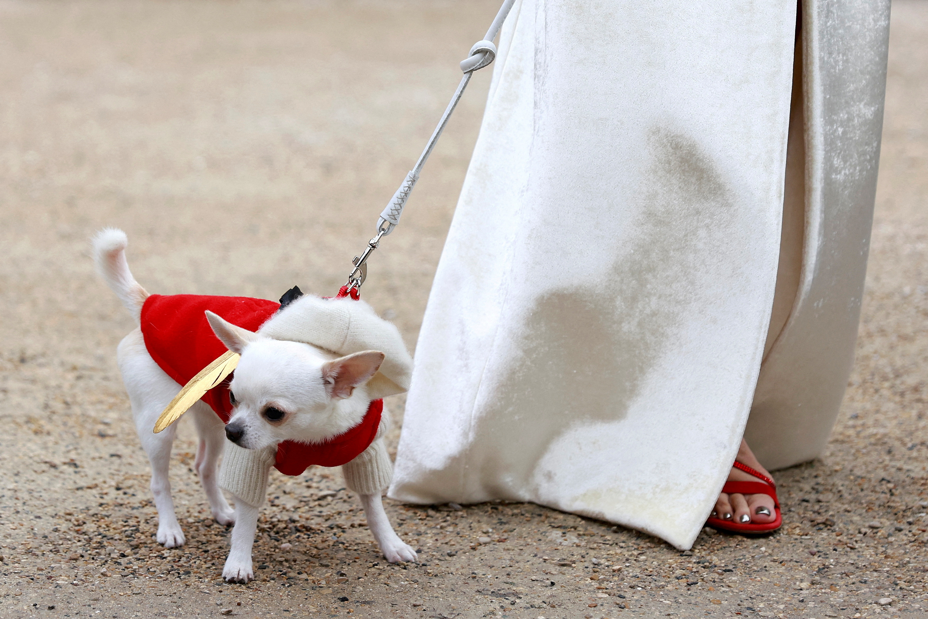 A guest leaves with her dog after the Schiaparelli Haute Couture Spring/Summer 2025 collection show in Paris, France on January 27, 2025. (Photo by Abdul Saboor/Reuters)