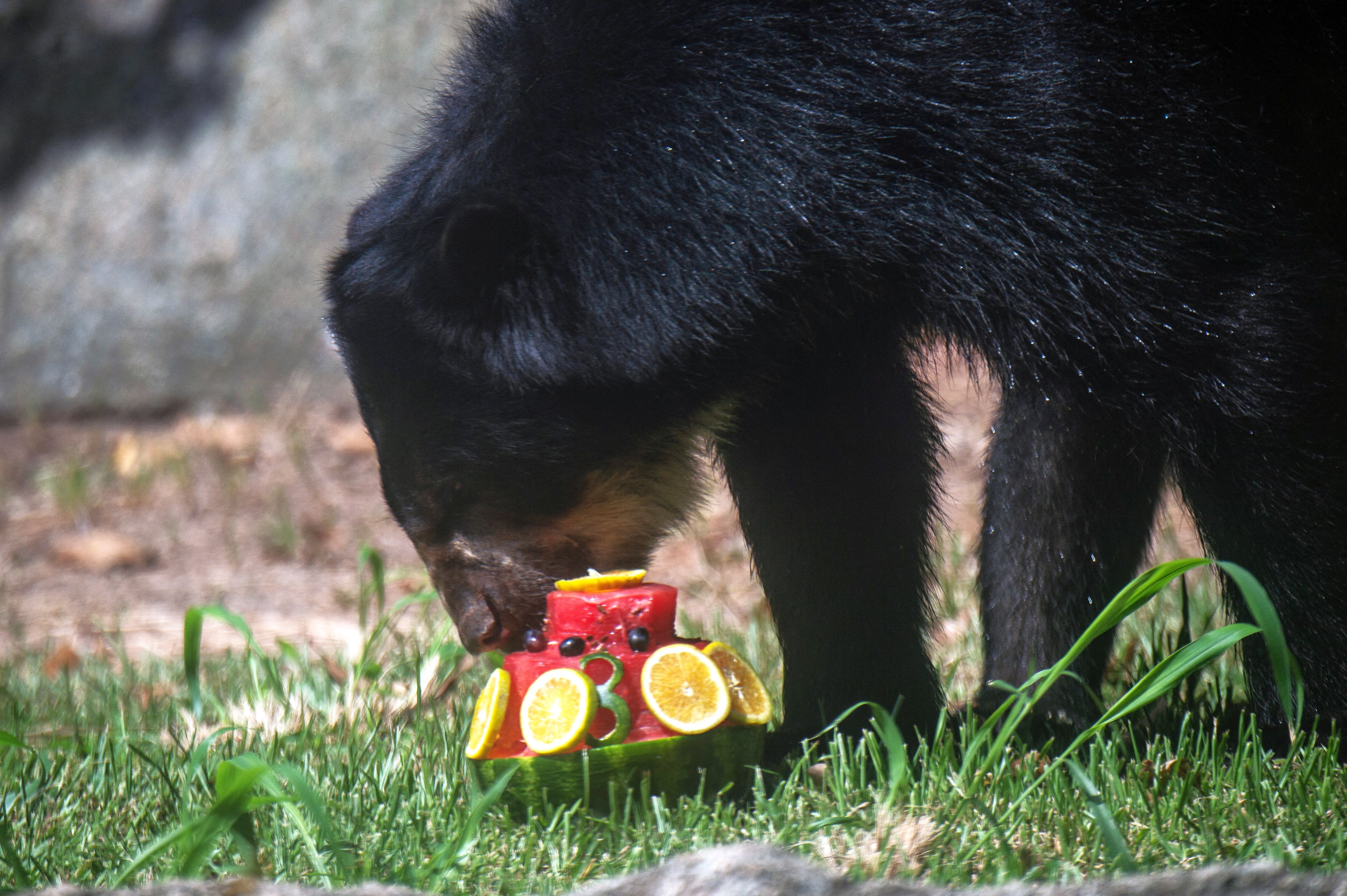 A spectacled bear (Tremarctos ornatus) eats ice popsicles at the BioPark Zoo in Rio de Janeiro, Brazil, on January 22, 2025. Zookeepers offer popsicles made of ground meat or fruit to the animals amid high summer temperatures. (Photo by Tercio Teixeira/AFP Photo)
