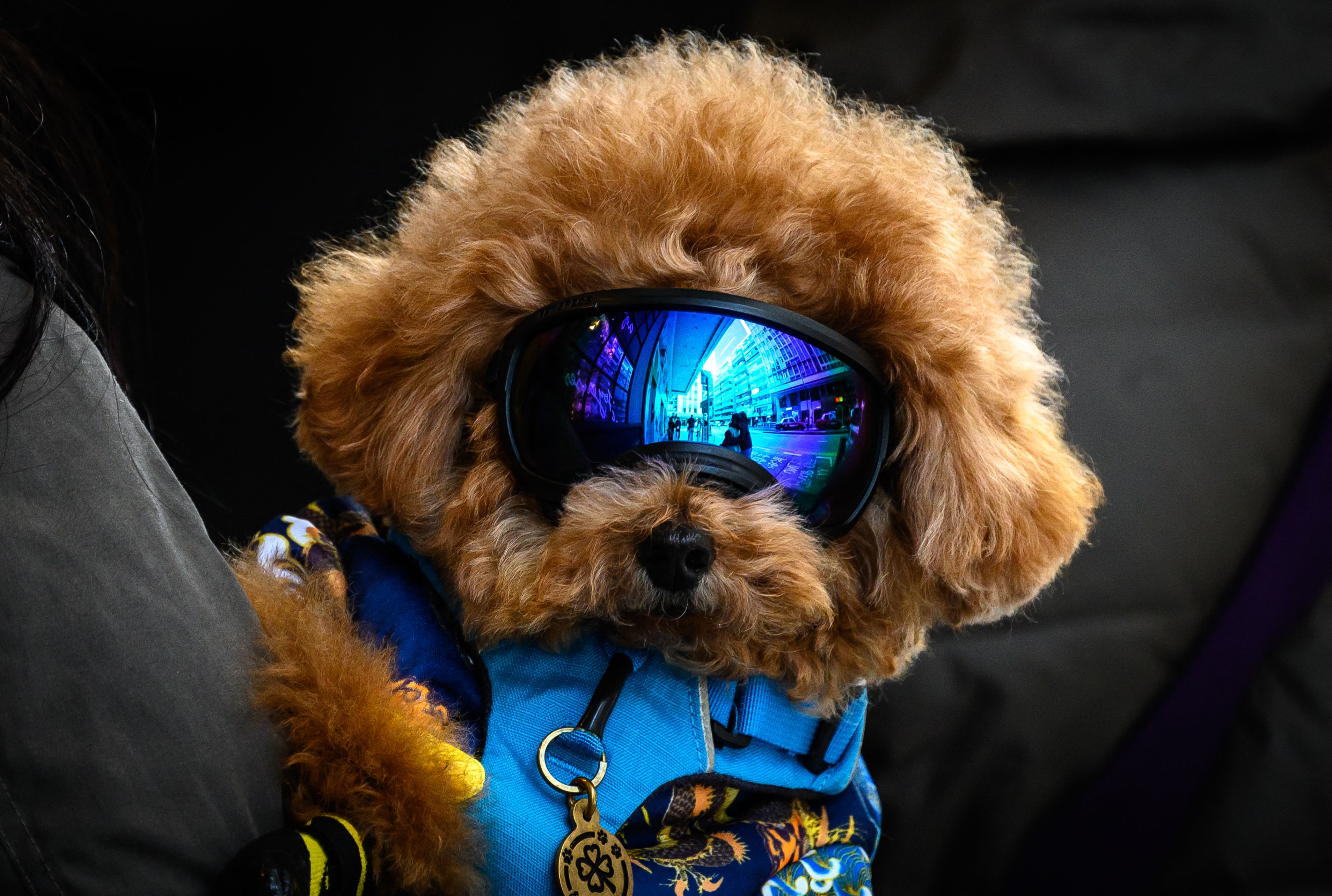 A Hong Kong street is reflected on a dog's sunglasses on January 30, 2025. (Photo by Mladen Antonov/AFP Photo)