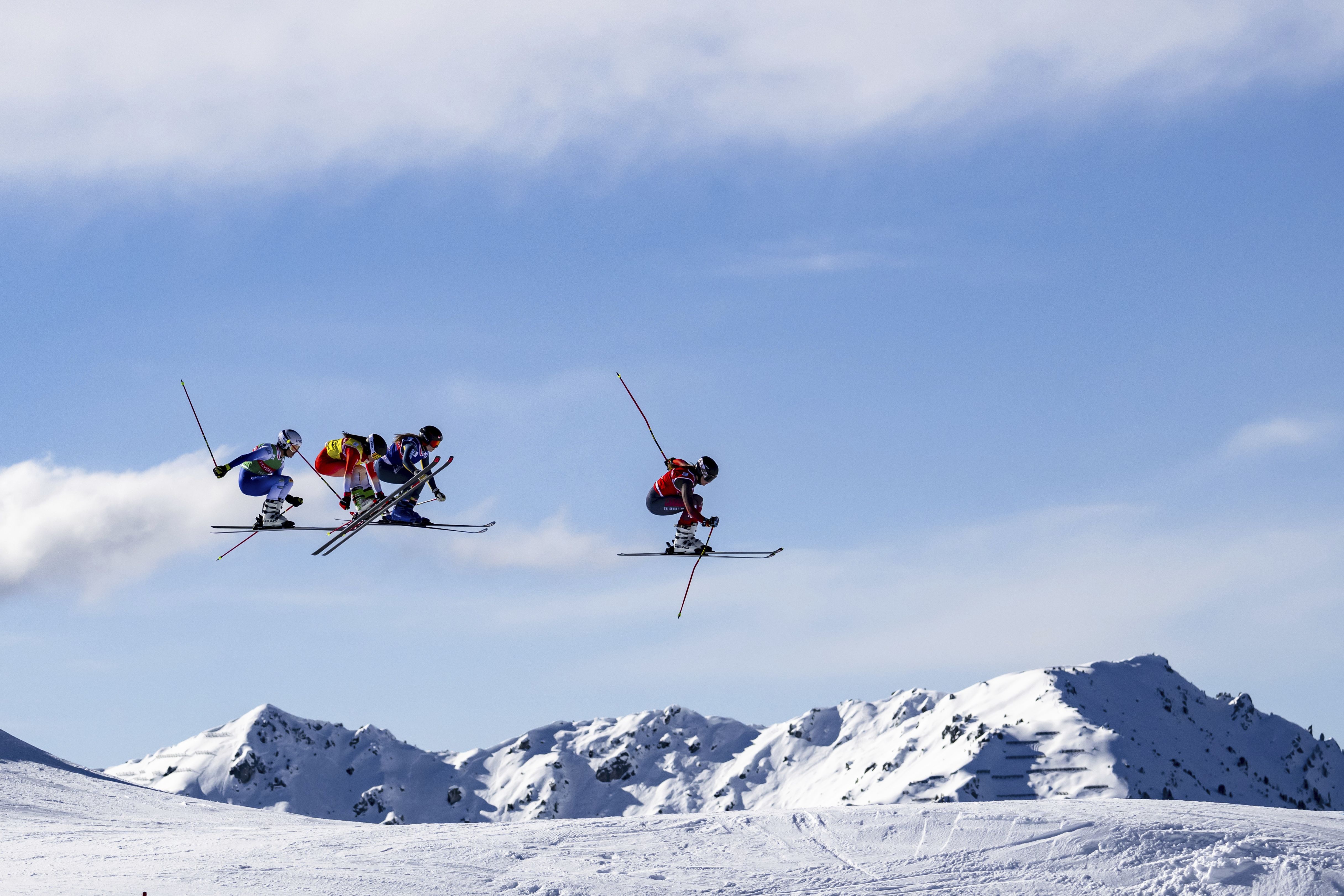From left, Jole Galli of Italy, Isabelle Zippert of Switzerland, Uma Kruse Een of Sweden and India Sherret of Canada in action during the quarterfinal of the women's Ski Cross event at the FIS Ski Cross, SX, World Cup, in Veysonnaz, Switzerland, Saturday, February 1, 2025. (Photo by Jean-Christophe Bott/Keystone via AP Photo)