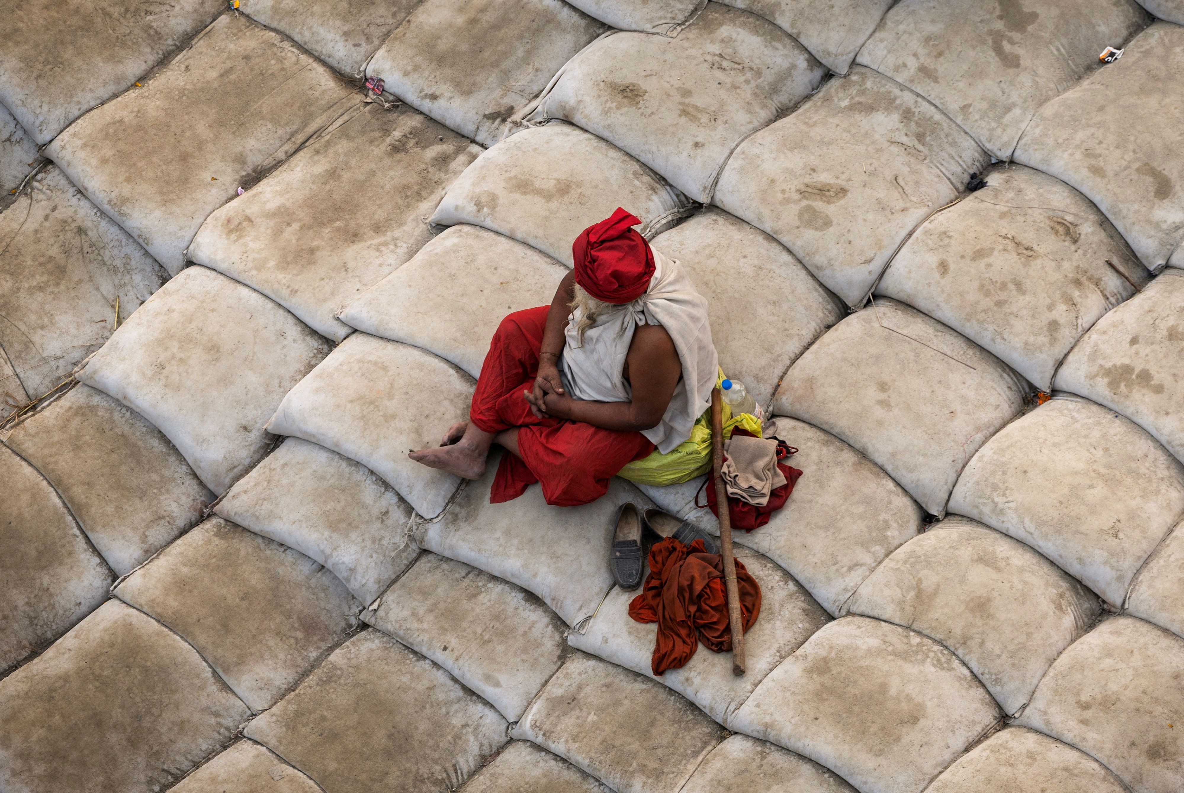 A Sadhu or a Hindu holy man sits on the banks before taking a holy dip at Sangam, the confluence of the Ganges and Yamuna rivers with the mythical, invisible Saraswati river, during the “Maha Kumbh Mela”, or the Great Pitcher Festival, in Prayagraj, India, on January 13, 2025. (Photo by Adnan Abidi/Reuters)