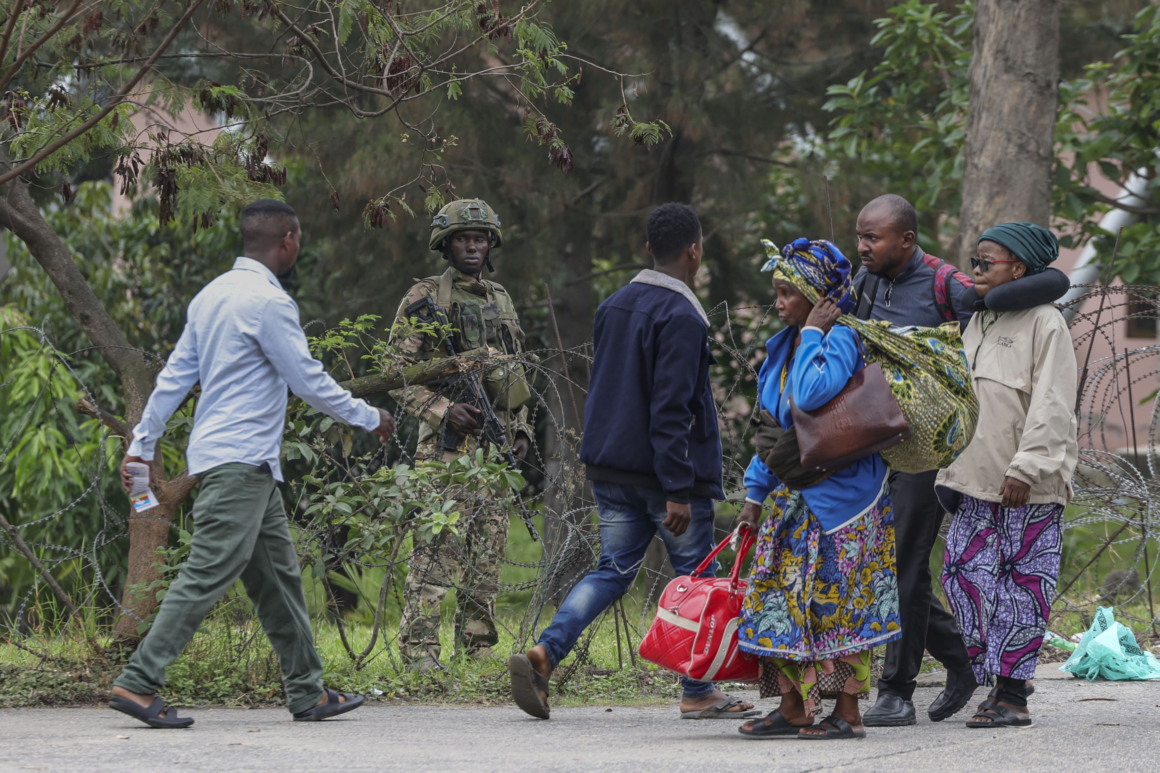 A member of the M23 armed group holds position behind barbed wire as civilians fleeing ongoing clashes in eastern Democratic Republic of Congo cross the border into Rwanda at the La Corniche Border Post in Gisenyi on January 29, 2025. The fate of DR Congo's besieged city of Goma appeared to be all but sealed on January 29, 2025, after Rwandan-backed fighters seized control of the airport and most of the centre and neighbourhoods of the key mineral trading hub. (Photo by Tony Karumba/AFP Photo)