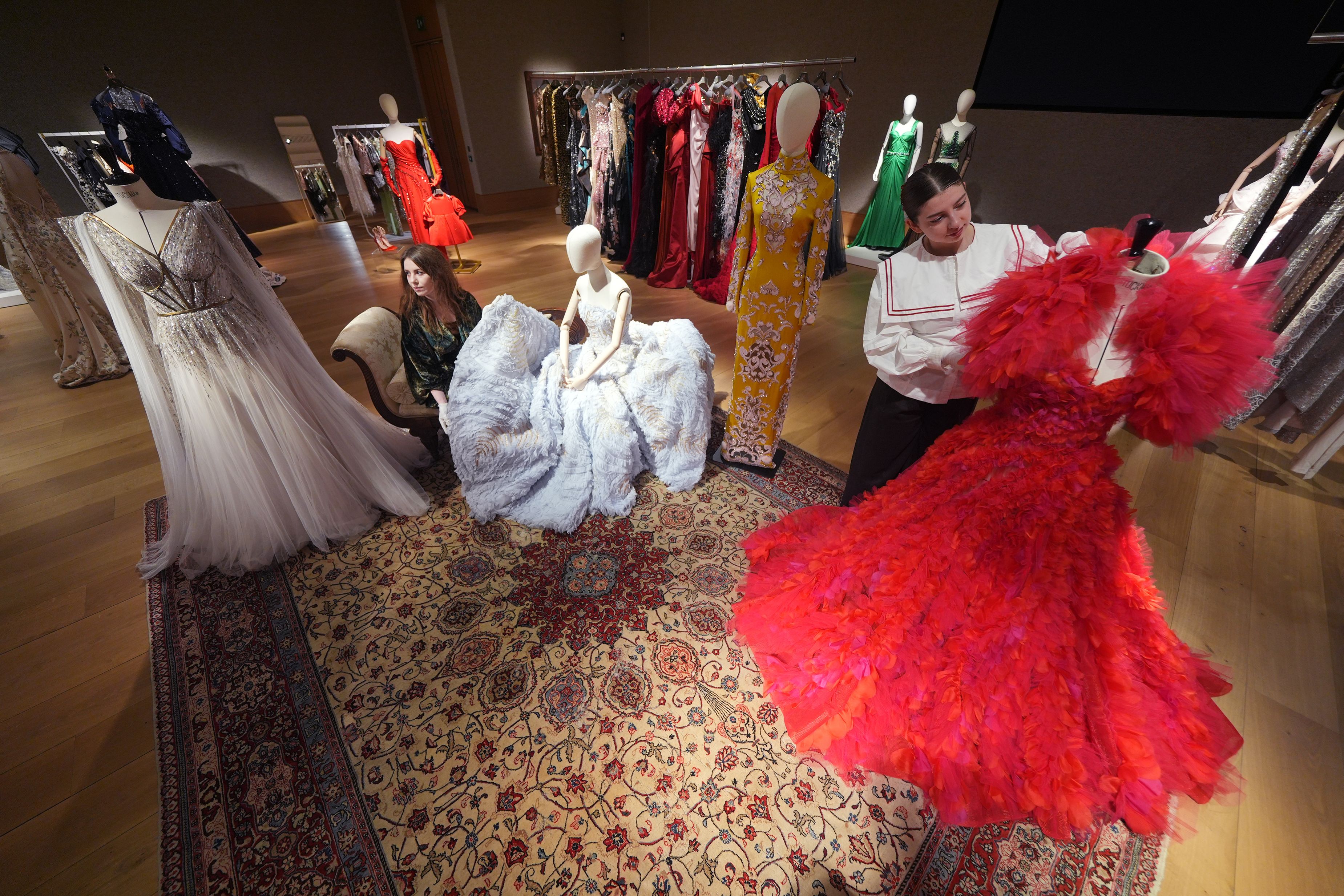 An Angelina Jolie Worn custom made gown (custom made for her for the premiere of “Maleficent: Mistress of Evil” in London, 2019), estimate £5,000 – £8,000; a Zendaya Worn Ballgown (worn for a photo shoot with W Magazine in 2017), estimate £4,000 – £6,000; a Nicole Kidman worn gown (worn by her to the GQ Awards in 2019), estimate £3,000 – £5,000, and an Anne Hathaway worn ballgown and bolero (worn to the virtual premiere of “The Witches” in London, during the COVID-19 pandemic), estimate £5,000 – £8,000, on display at Bonhams in London, part of the Couture Archive of Ralph and Russo sale on January 21, 2025, 2020. (Photo by Yui Mok/PA Images via Getty Images)
