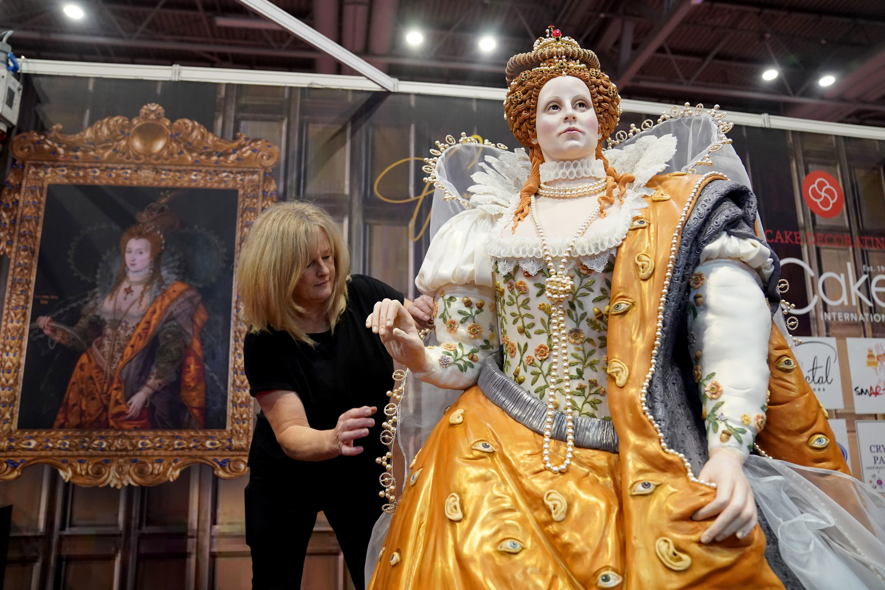 A Queen Elizabeth I cake is touched up by creator, Emma Jayne Cake Design (left) while on display during a photo call for the Cake International show at the NEC in Birmingham on Friday, November 1, 2023. (Photo by Jacob King/PA Wire)
