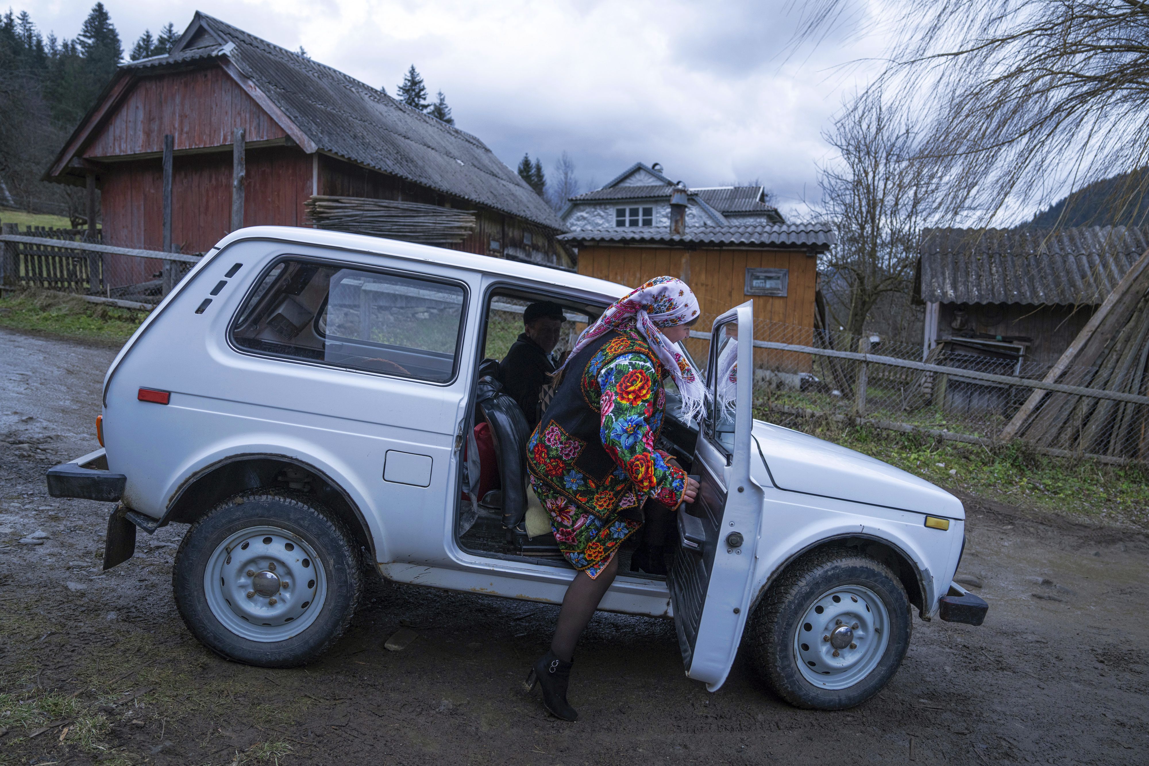 A woman dressed in a traditional hutsuls suit gets into a car near a church during Christmas celebration in Kryvorivnia village, Ukraine, Monday, December 25, 2023. (Photo by Evgeniy Maloletka/AP Photo)