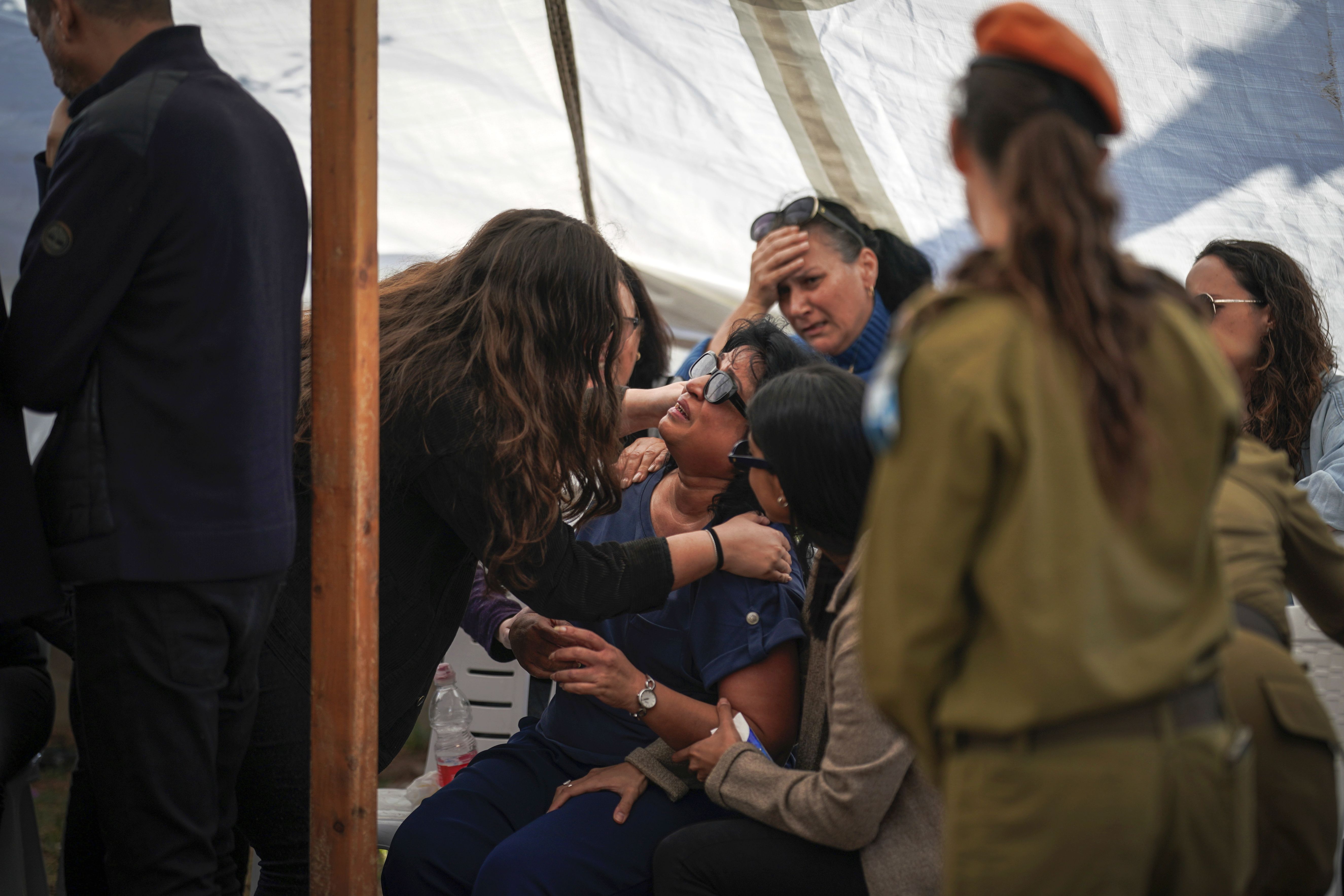 Mourners comfort Mazal Daniels, center, the mother of Israeli reservist Master Sgt. Gil Daniels during his funeral in Ashdod, Wednesday, December 6, 2023. Daniels was killed in Gaza during an Israeli military ground offensive against the enclave's militant Hamas rulers. (Photo by Leo Correa/AP Photo)